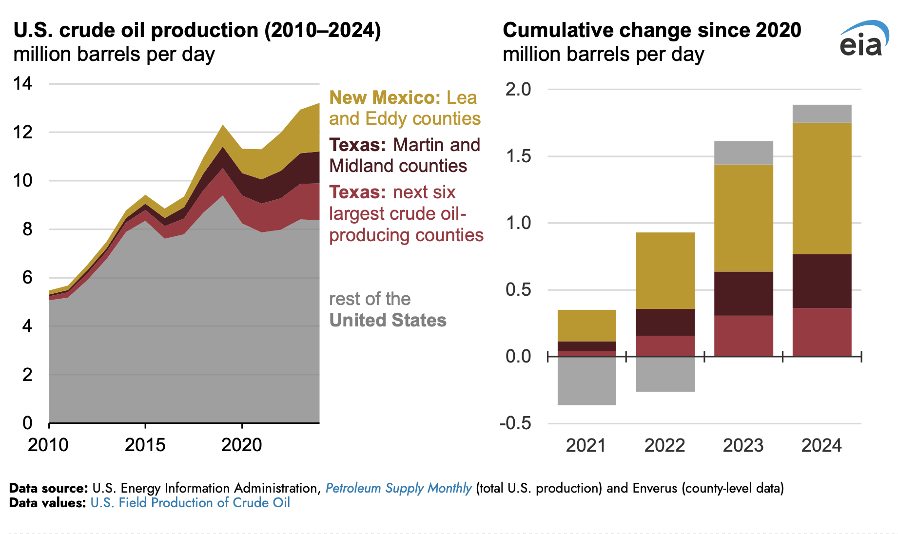 Entre 2020 y 2024, la producción total de petróleo crudo y condensado de arrendamiento en los Estados Unidos creció en 1.9 millones de barriles por día (b/d), el 93 % de los cuales se produjo en solo 10 condados de Texas y Nuevo México. La producción del resto de los Estados Unidos, incluidas las áreas de producción en aguas estatales o federales en alta mar, creció en solo 130,000 b/d.