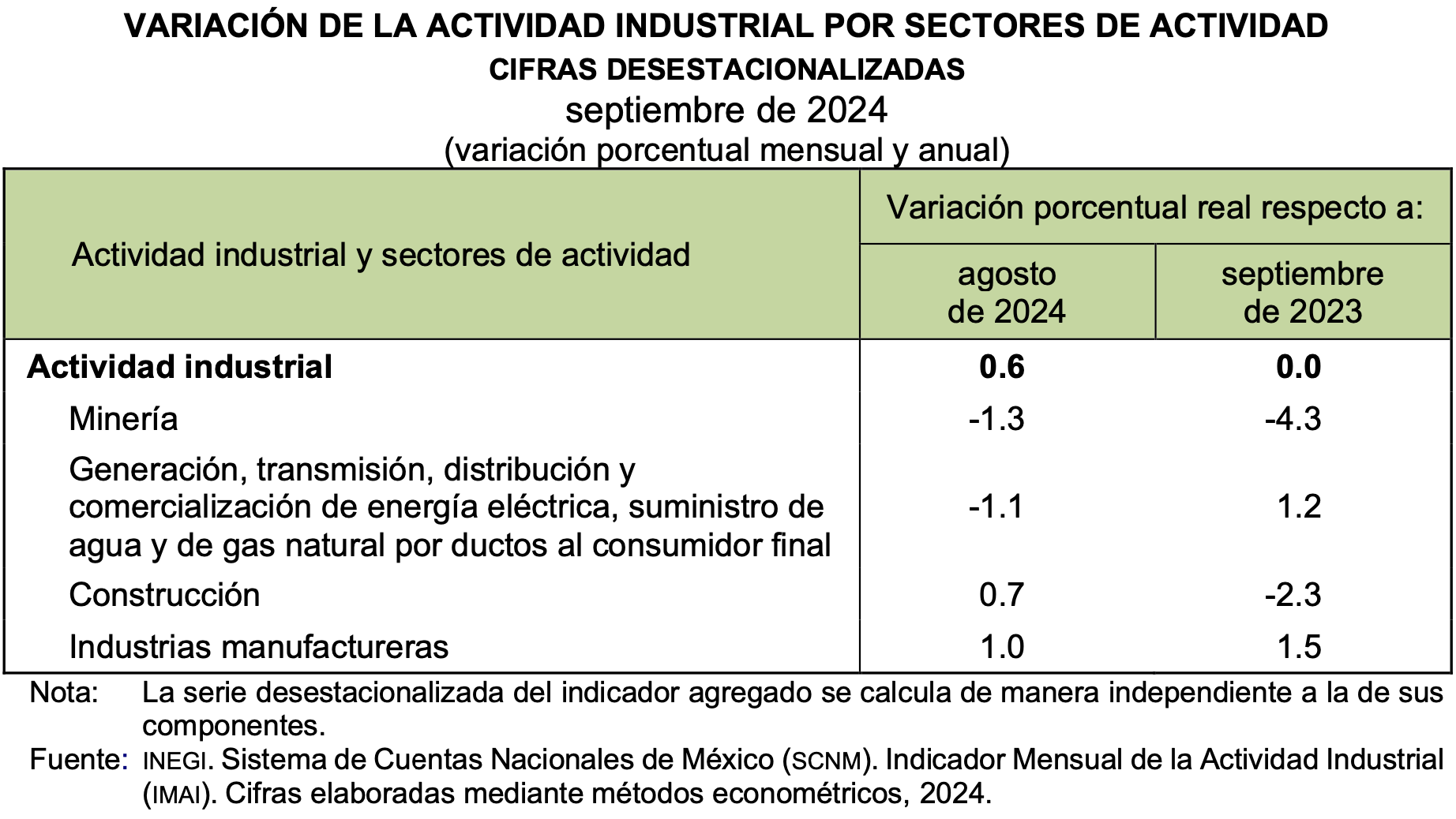 En septiembre de 2024 y con cifras desestacionalizadas, la actividad industrial aumentó 0.6 % a tasa mensual, su quinta alza en el año.