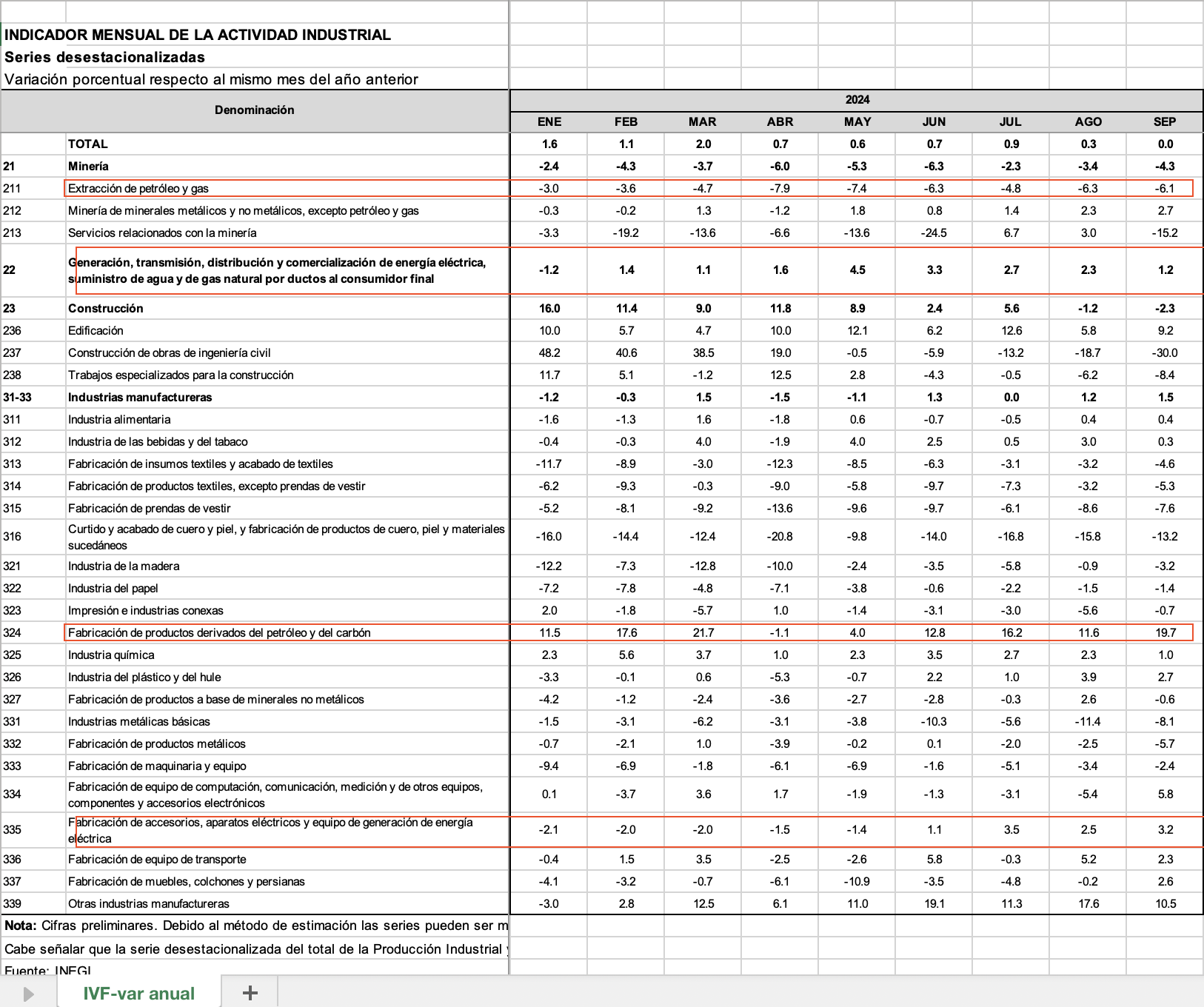Durante los primeros nueve meses de 2024, la actividad industrial del sector energético muestra un comportamiento negativo en la industria petrolera, mientras que en la industria gas, electricidad y agua, es lento.