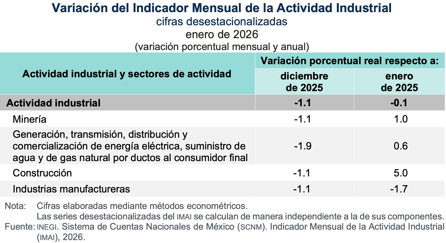 Los otros sectores que componen el indicador, la Minería, la Construcción e las Industrias manufactureras retrocedieron 1.1 por ciento, en el mes de enero.