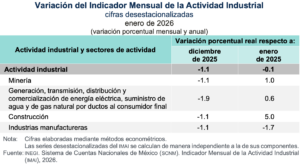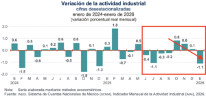 El resultado de enero de 2026 contra enero de 2025, para la actividad industrial se registró una baja de -0.1%, un comparativo que ha sido muy inestable en el último año.