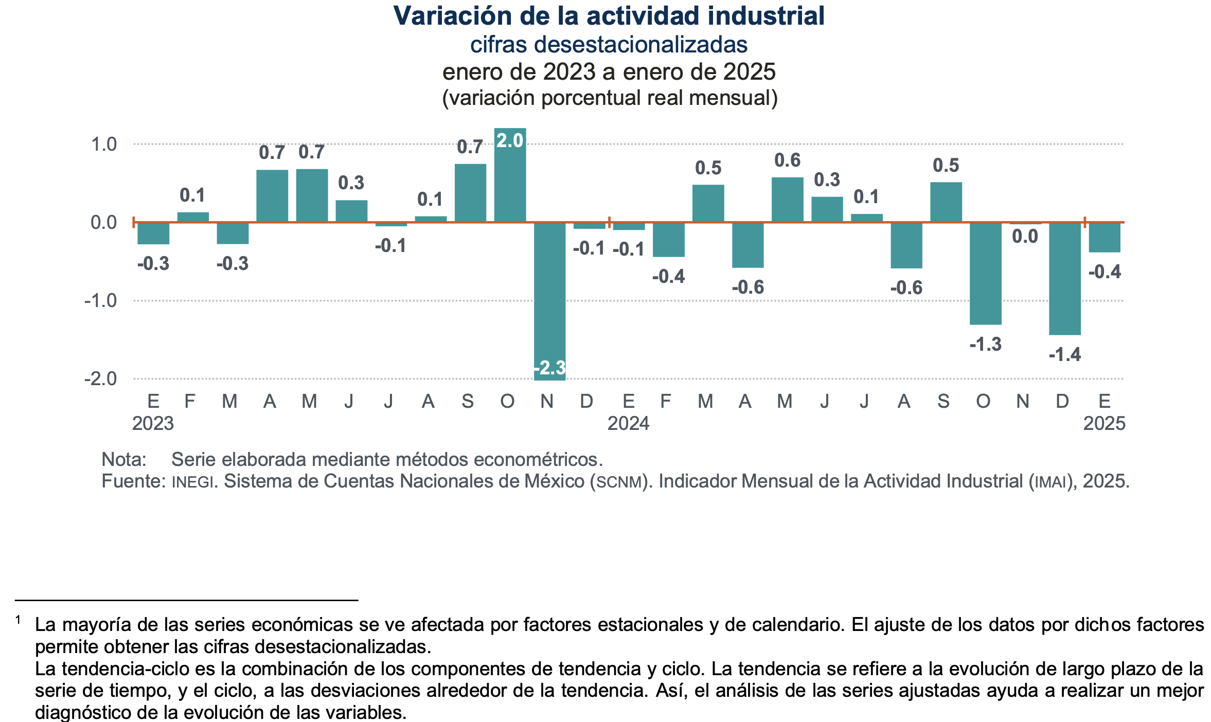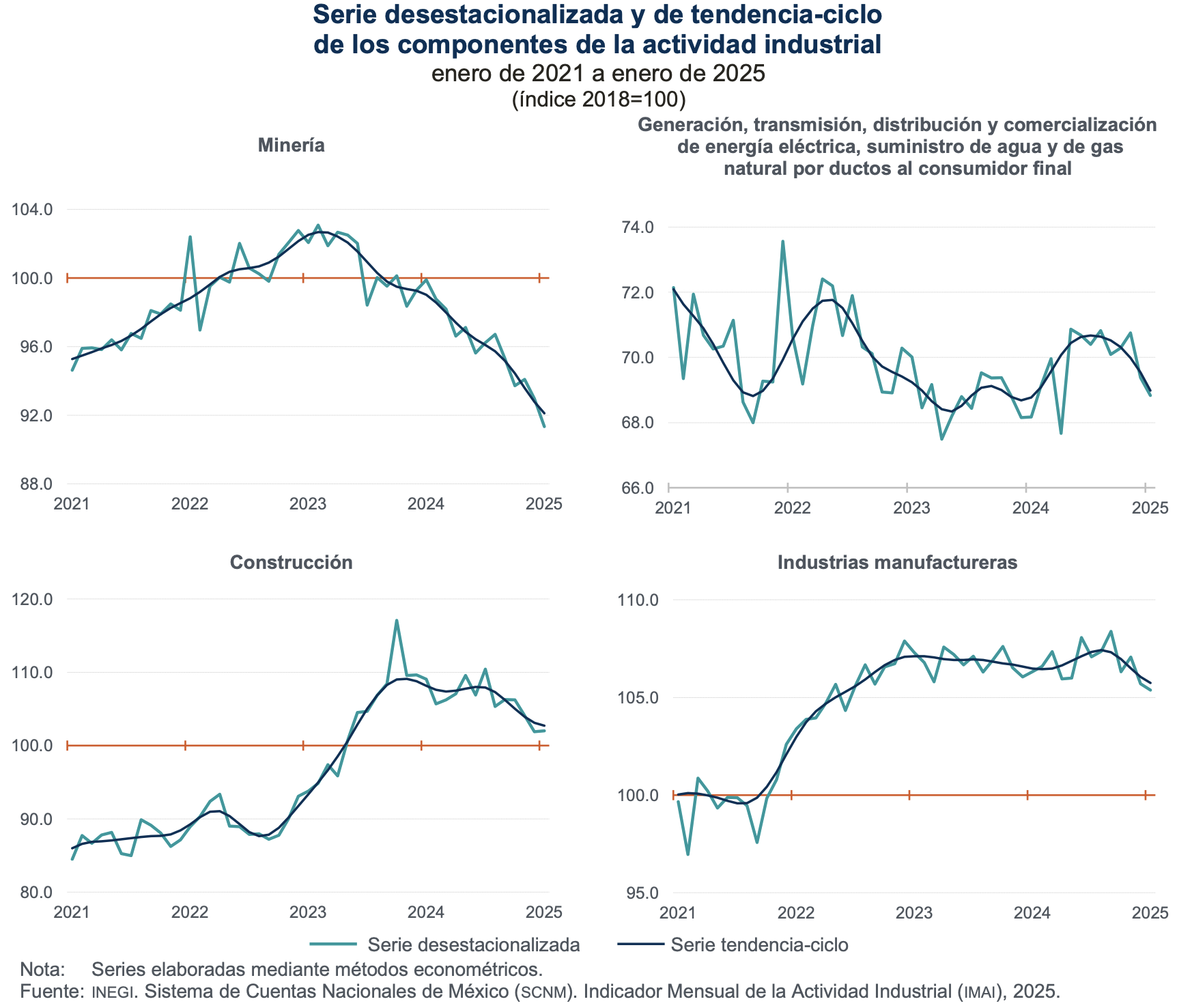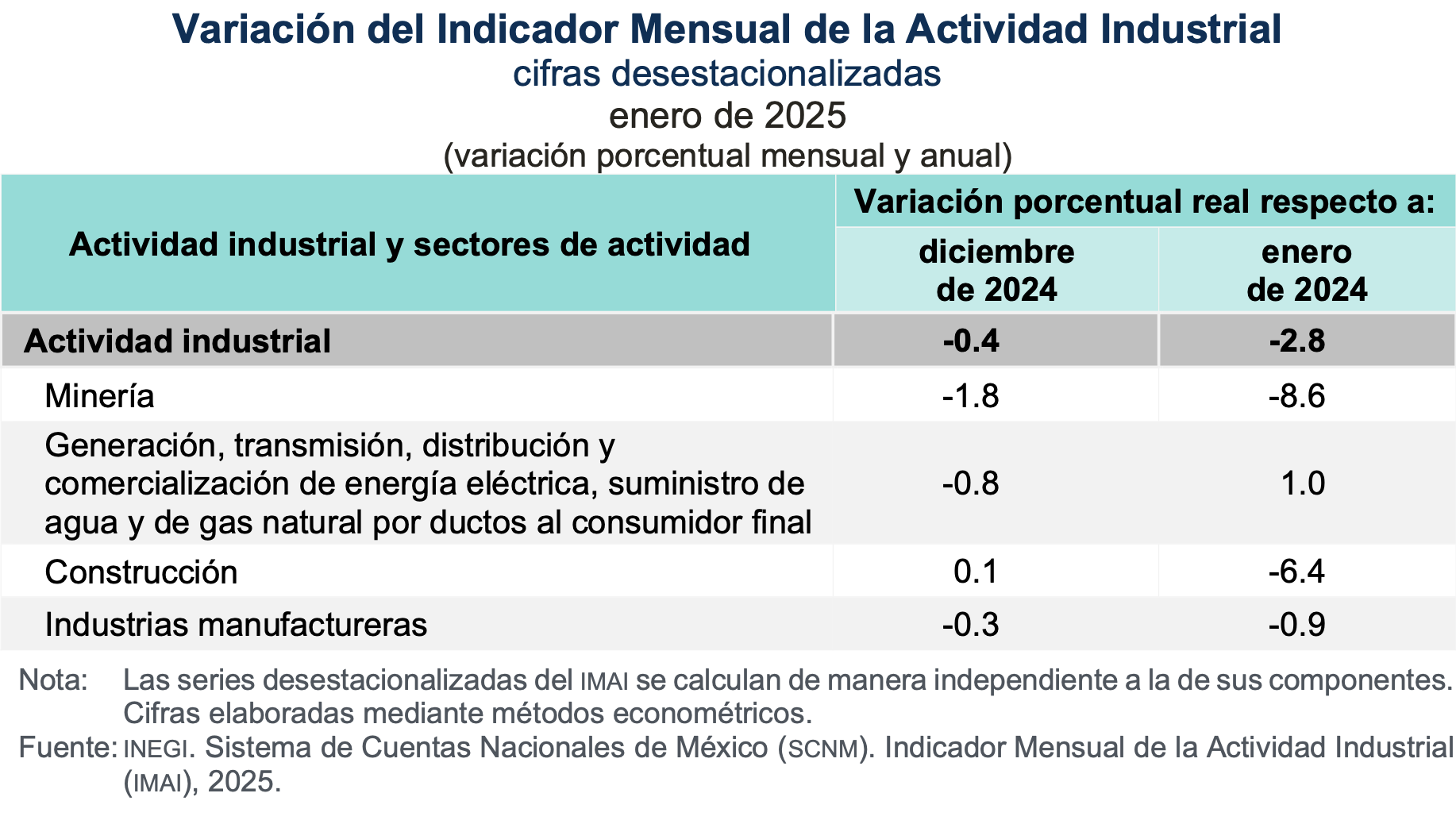 En la comparación anual, en enero de 2025, Minería cayó -8.6 %; Construcción, -6.4 % e Industrias manufactureras, 0.9 por ciento. Generación, transmisión, distribución y comercialización de energía eléctrica, suministro de agua y de gas natural por ductos al consumidor final avanzó 1.0 %.