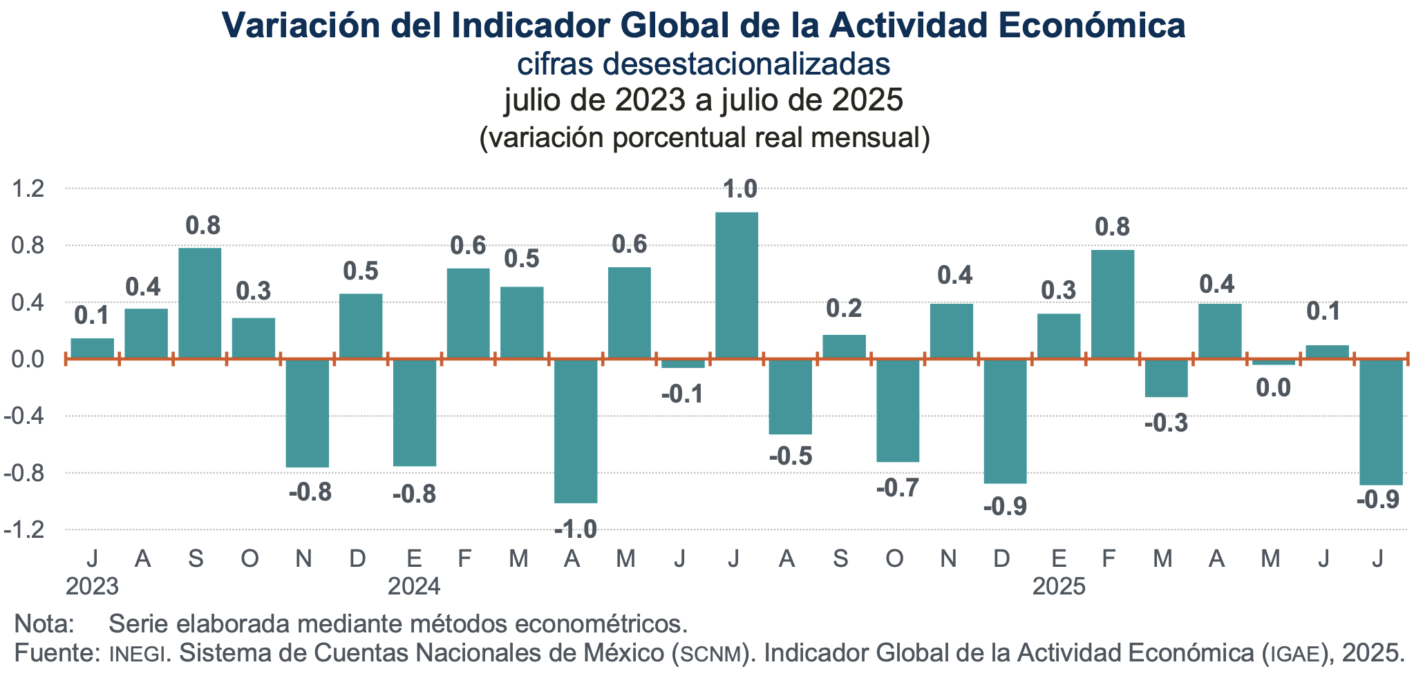 En julio de 2025 y con cifras desestacionalizadas,1 el IGAE descendió 0.9 % respecto a junio pasado, en términos reales, su segunda caída en el año y la más pronunciada.