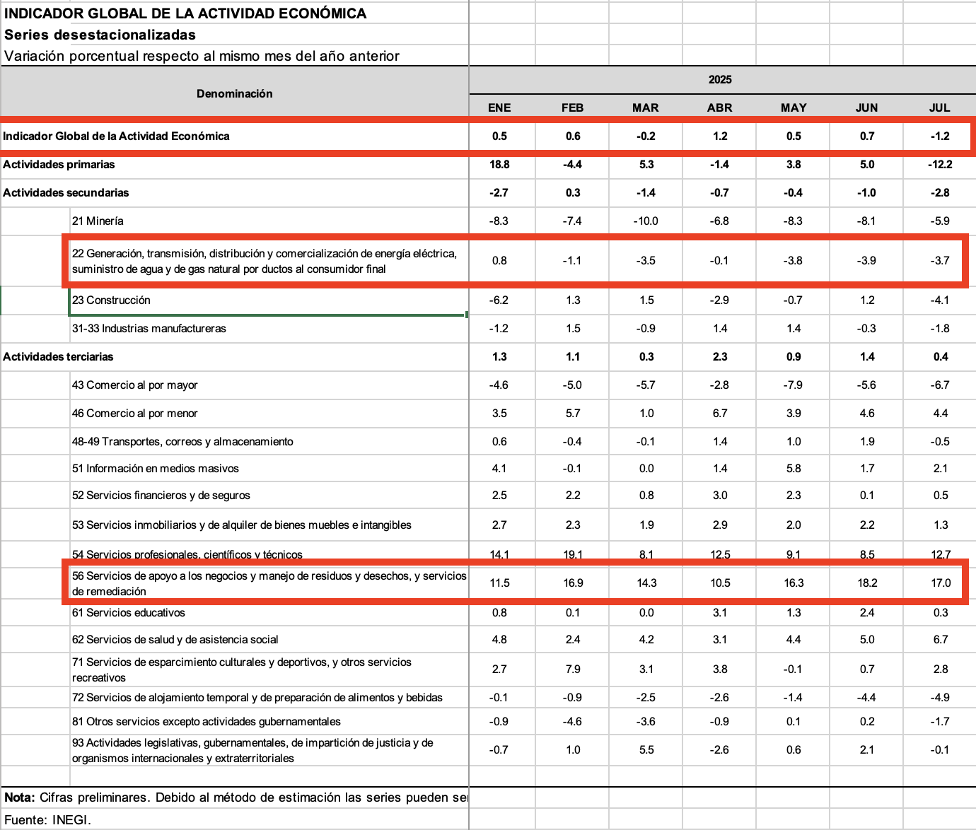 No obstante, las malas noticias para la economía, la nota importante es que las actividades de servicios de apoyo a los negocios y manejo de residuos y desechos, y servicios de remediación, actividades clave en la economía circular, reportan un avance de 17% anual en julio. Pero no es una golondrina en verano, todo el 2025 se observan tasas anuales de dos dígitos: enero, 11.5% anual; febrero, 16.9%;  marzo, 14.3%; abril, 10.5%; mayo, 16.3%, y junio, 18.2%.