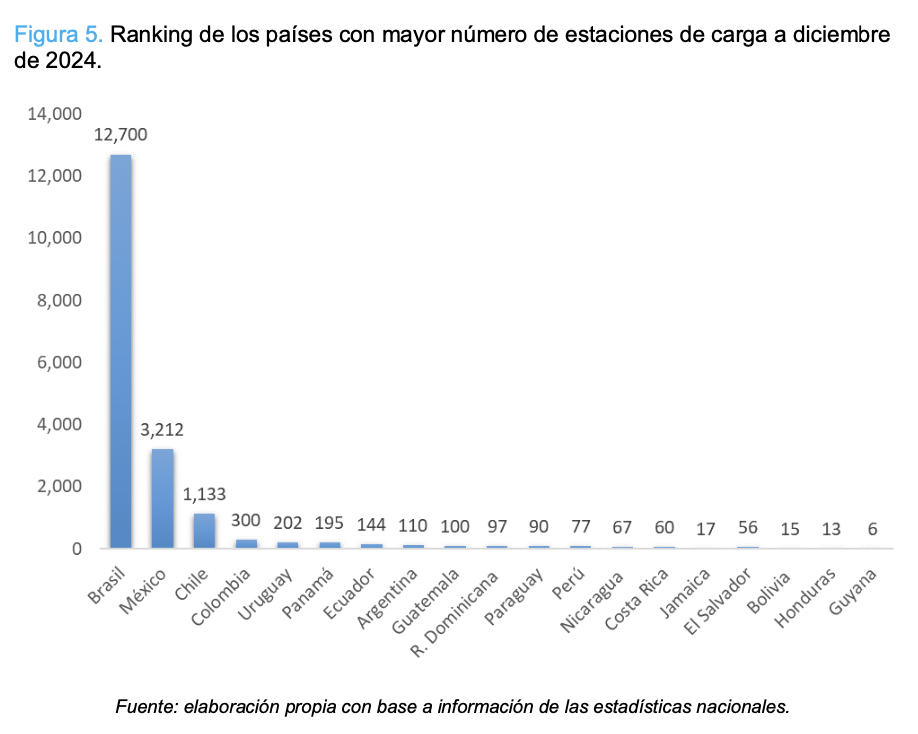 Brasil y México destacan en el desarrollo de infraestructura de carga pública. En el caso de Brasil el año 2023 tenía 1,876 estaciones de carga aumentando a 12,700 al final de 2024. México, por su parte, pasó de 1,340 a 3,212 en el mismo período. Juntos, estos países representan aproximadamente el 86% de la infraestructura de carga en la región.