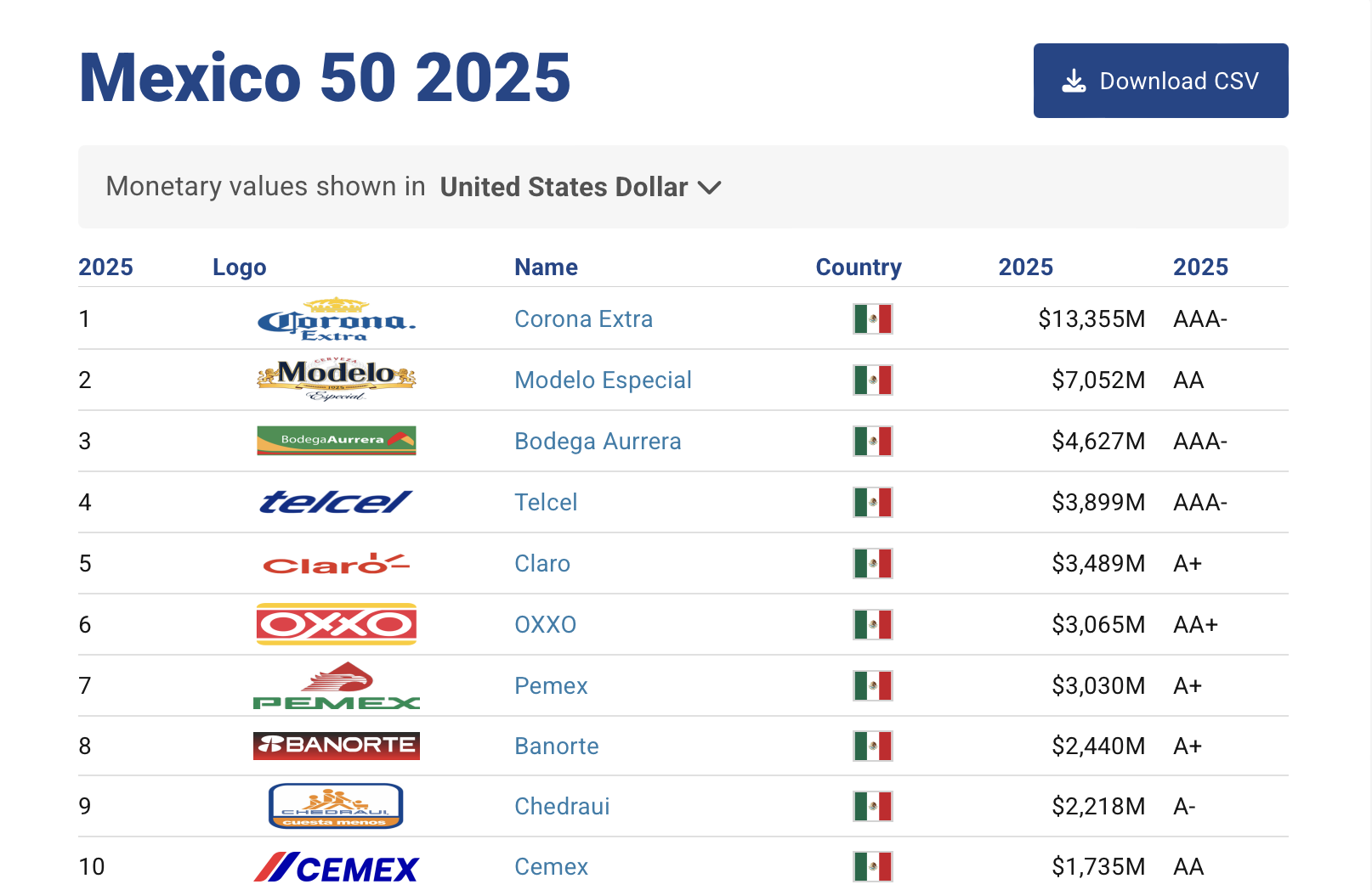 Brand Finance México 50 2025 publicó la lista de las 50 marcas más valiosas de México, donde Grupo Modelo aparece en el primer lugar por sexto año consecutivo. En el top de las 10 más marcas más importantes 8 son del sector comercial y servicios y apenas dos del sector industrial Pemex y Cemex.