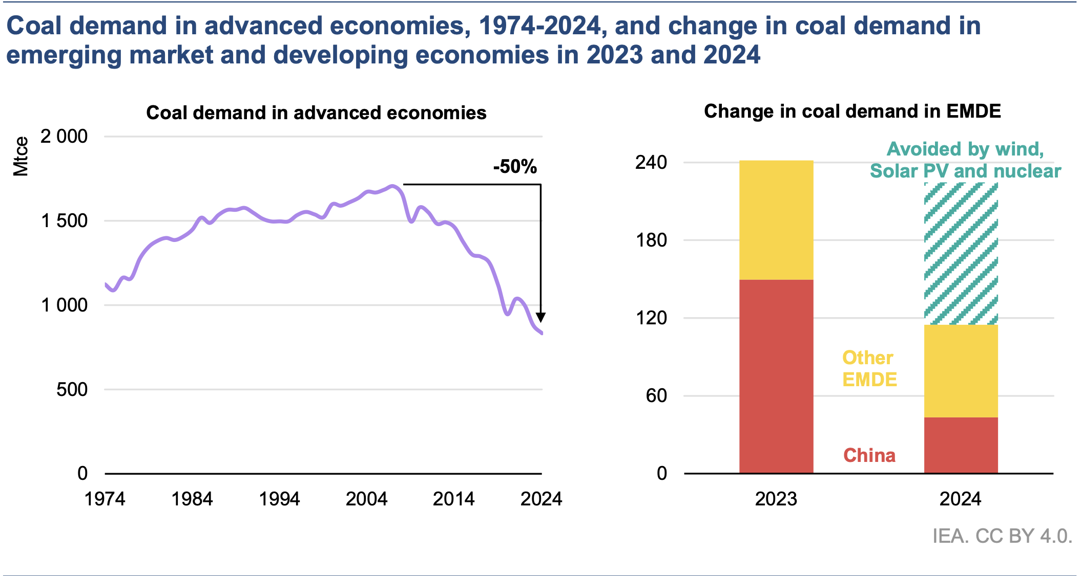 Las emisiones de CO2 en las economías avanzadas cayeron un 1.1 % a 10,900 millones de toneladas en 2024, un nivel visto por última vez hace 50 años, a pesar de que el PIB acumulado de estos países es ahora tres veces mayor. La mayor parte del crecimiento de las emisiones en 2024 vino de economías emergentes y en desarrollo distintas de China. Aunque el crecimiento de las emisiones en China se desaceleró en 2024, las emisiones per cápita del país están ahora un 16 % por encima de las de las economías avanzadas y casi el doble del promedio mundial.
