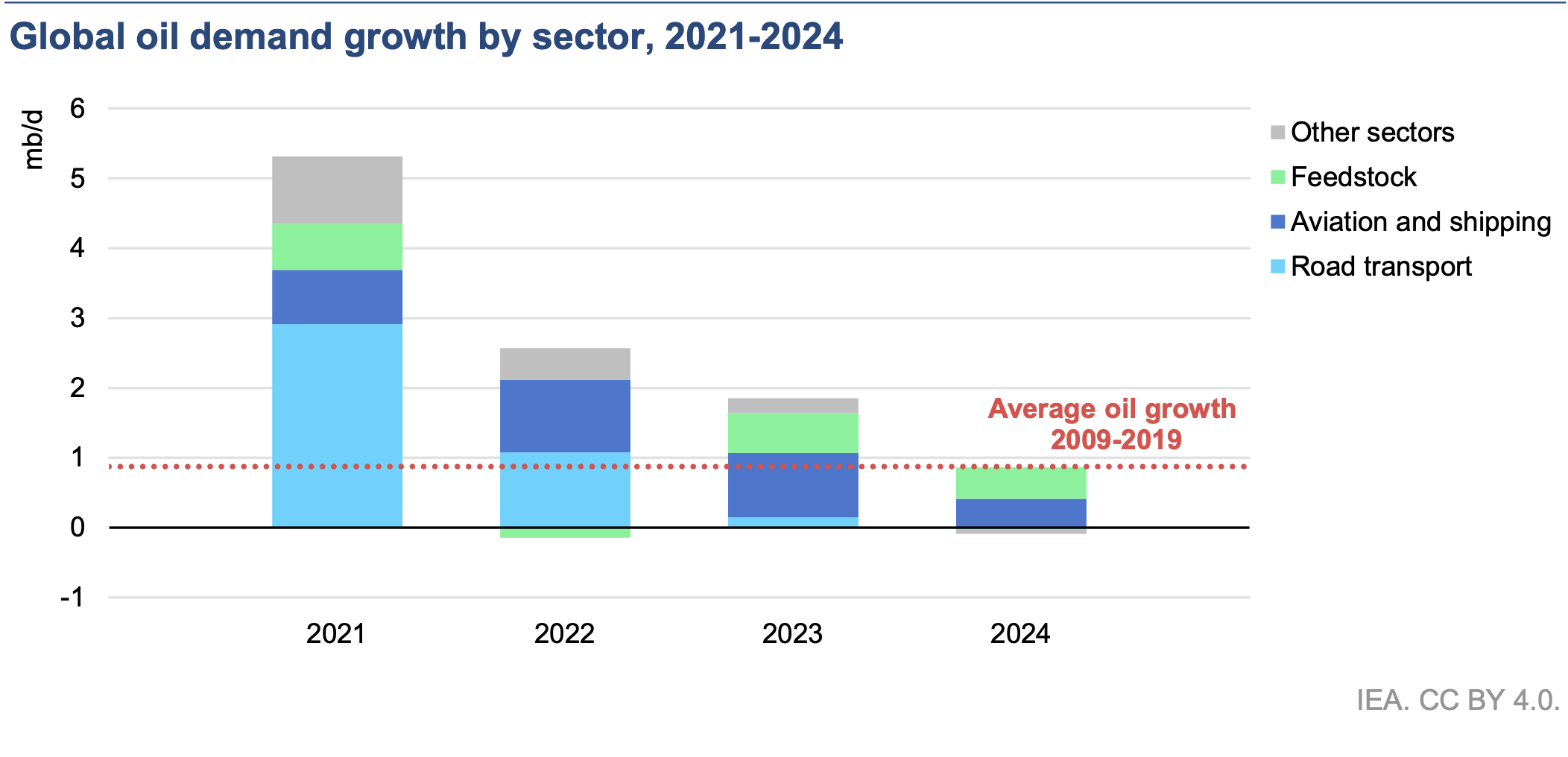 Mientras tanto, la demanda de petróleo creció más lentamente, aumentando un 0.8 % en 2024. La participación del petróleo en la demanda total de energía cayó por debajo del 30 % por primera vez, 50 años después de que alcanzara un máximo del 46 %. Las ventas de coches eléctricos aumentaron más del 25 % el año pasado, con modelos eléctricos que representan uno de cada cinco coches vendidos en todo el mundo. Esto contribuyó considerablemente a la disminución de la demanda de petróleo para el transporte por carretera, que compensó una proporción significativa del aumento del consumo de petróleo para la aviación y la petroquímica.