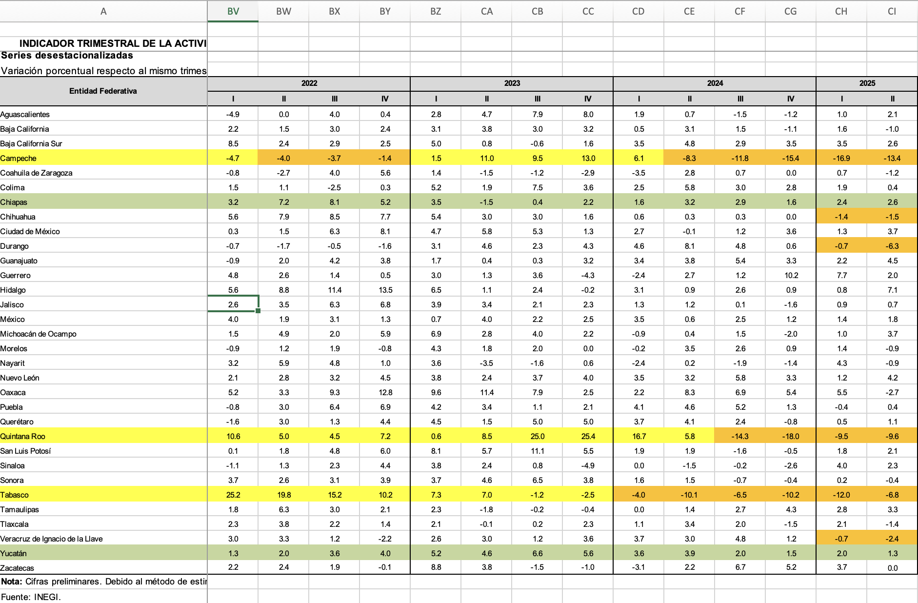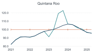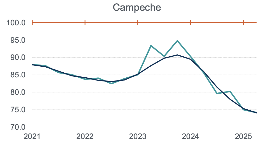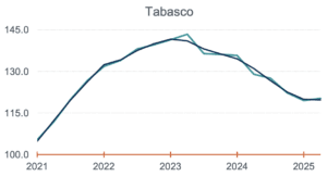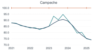 Durante el segundo trimestre de 2025, la actividad económica de Campeche, Quintana Roo y Tabasco se desploma con caídas del 13.9% anual; 9.6% y 6.8%, se colocan con las mayores caídas del país.