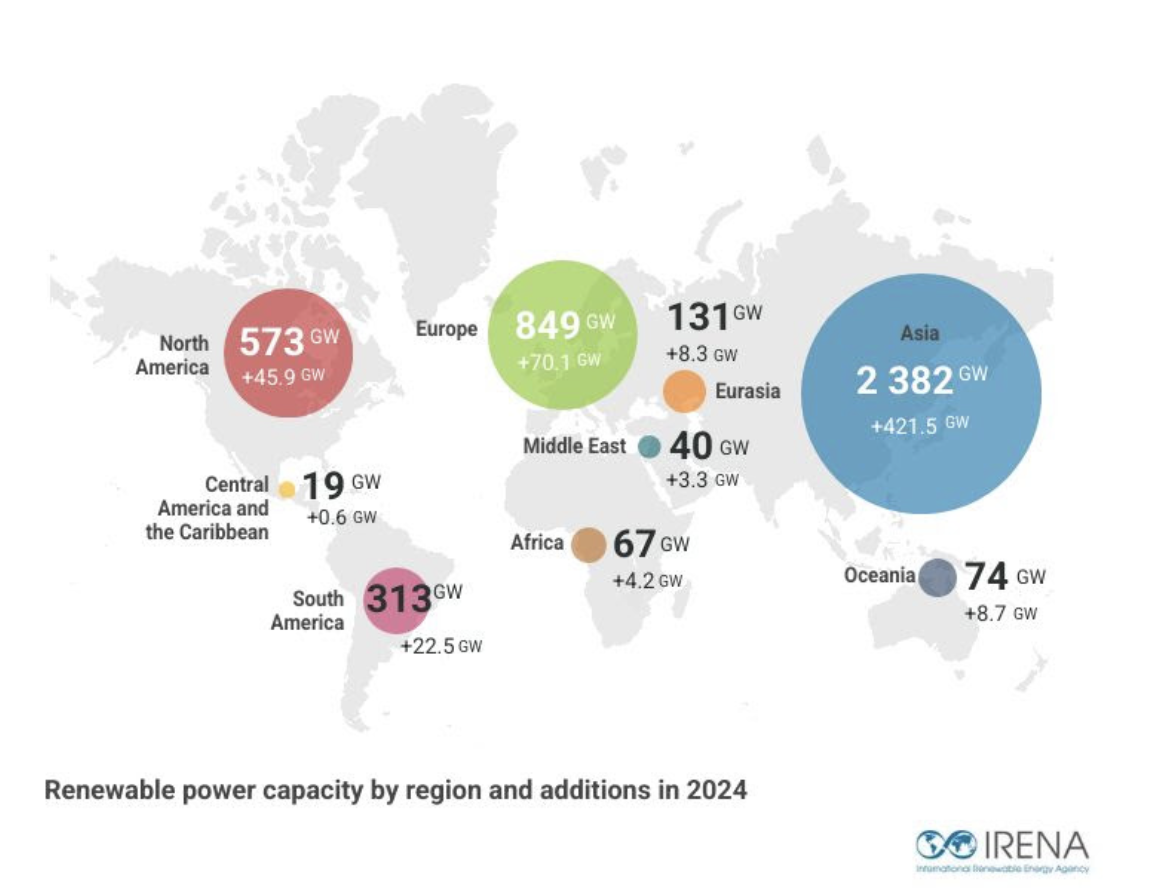 Abu Dabi, Emiratos Árabes Unidos, 26 de marzo de 2025 – Las Estadísticas de Capacidad Renovable 2025, publicadas hoy por la Agencia Internacional de Energías Renovables (IRENA), muestran un aumento considerable de la capacidad de energía renovable durante 2024, alcanzando los 4,448 gigavatios (GW). La adición de 585 GW el año pasado representa una participación del 92.5 % en la expansión total de la capacidad y una tasa récord de crecimiento anual (15.1 %).