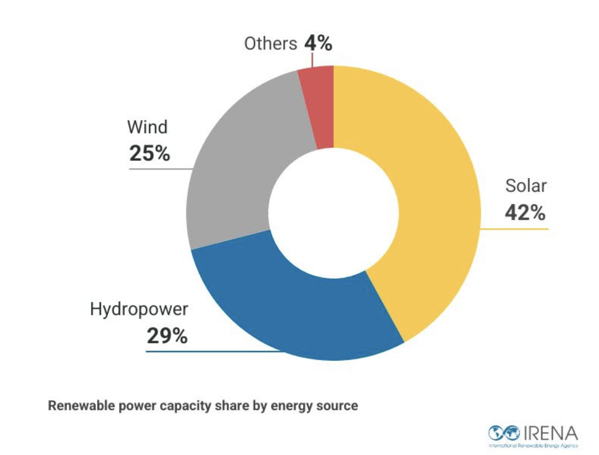 La energía solar y eólica continuaron expandiéndose al máximo, representando en conjunto el 96,6% de todas las adiciones netas de energías renovables en 2024. Más de tres cuartas partes de la expansión de la capacidad se debió a la energía solar, que aumentó un 32,2% y alcanzó los 1.865 GW, seguida de la energía eólica, que creció un 11,1%.