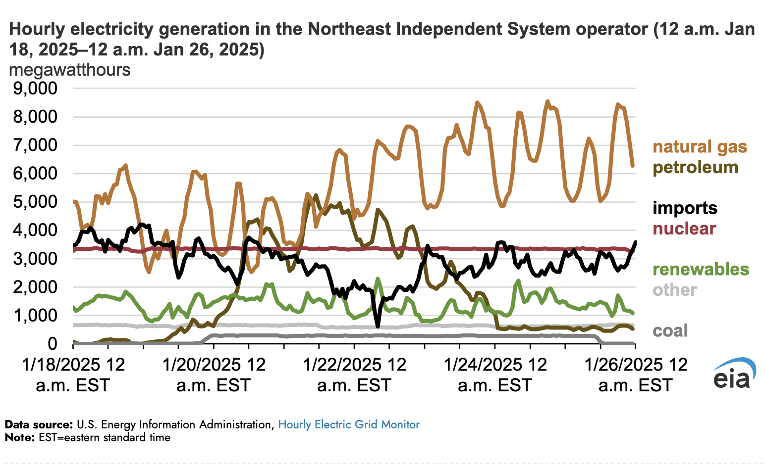 El petróleo y el carbón compensaron la reducción de la generación de las centrales eléctricas de gas natural del 18 al 22 de enero. Los precios del gas natural eran altos, y los suministros fueron escasos durante este período debido a la mayor demanda de gas natural de otros consumidores, como hogares y negocios. Más tarde en la semana, se puso a disposición más gas natural, incluido el suministro recibido de una terminal de importación de gas natural licuado (GNL) en Everett, Massachusetts. Este suministro ayudó a impulsar la generación de centrales eléctricas de gas natural a partir del 22 de enero.