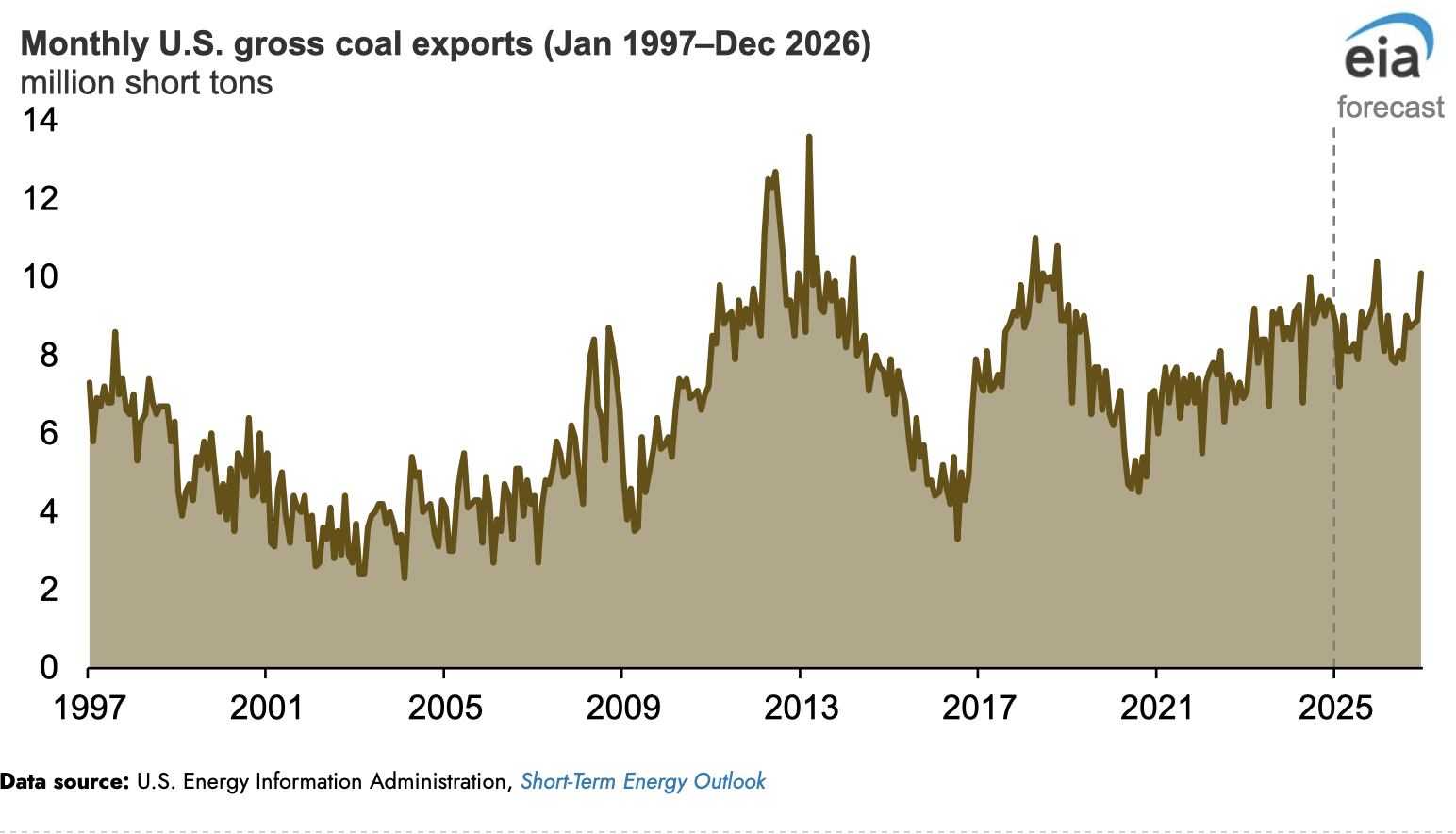 En nuestras Perspectivas Energéticas a Corto Plazo, pronosticamos que las exportaciones de carbón de los Estados Unidos superarán los 10,0 millones de toneladas cortas en solo dos meses durante 2025 y 2026, en diciembre de cada año.