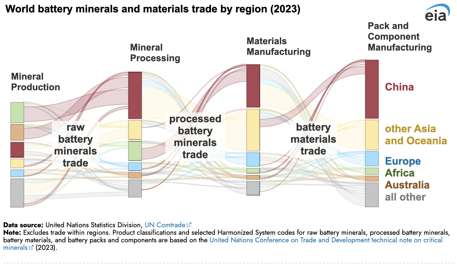 China tiene un papel importante en cada etapa de la cadena global de suministro de baterías y domina el comercio interregional de minerales. China importó casi 12 millones de toneladas cortas de minerales de batería crudos y procesados, lo que representa el 44 % del comercio interregional, y exportó casi 11 millones de toneladas cortas de materiales, paquetes y componentes de batería, o el 58 % del comercio interregional en 2023, según los datos regionales de la Comisión de la ONU.