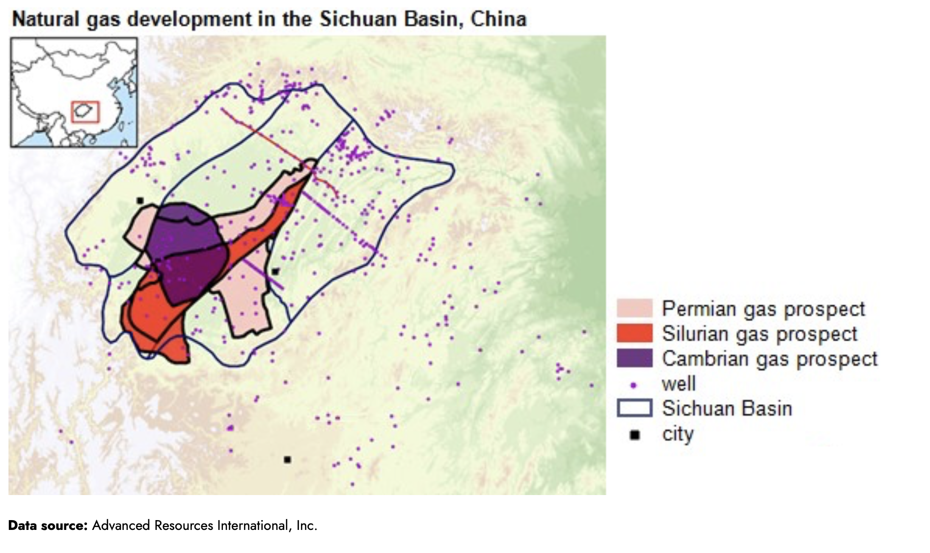 Actualmente, China es uno de los cuatro países del mundo donde se producen volúmenes comerciales de gas de esquisto. Los otros son Estados Unidos, Canadá y Argentina. Nuestro informe de Evaluaciones Mundiales de Recursos de Esquisto de 2015 estimó 1.115 billones de pies cúbicos de recursos de gas de esquisto técnicamente recuperables de las siete cuencas de gas natural más prospectivas de China. Más de la mitad de estos recursos se encuentran en la cuenca de Sichuan (626 billones de pies cúbicos). La región suroeste de la cuenca de Sichuan domina la actividad de arrendamiento y perforación de esquisto de China porque ofrece la mejor combinación de geología favorable, condiciones de superficie plana para la accesibilidad, oleoductos existentes, abundantes suministros de agua y acceso a los principales mercados urbanos de gas natural. Otras partes de la cuenca de Sichuan son estructural o topográficamente complejas o tienen una contaminación elevada por sulfuro de hidrógeno (H2S) que hace que el desarrollo comercial de gas de esquisto sea más difícil.