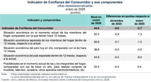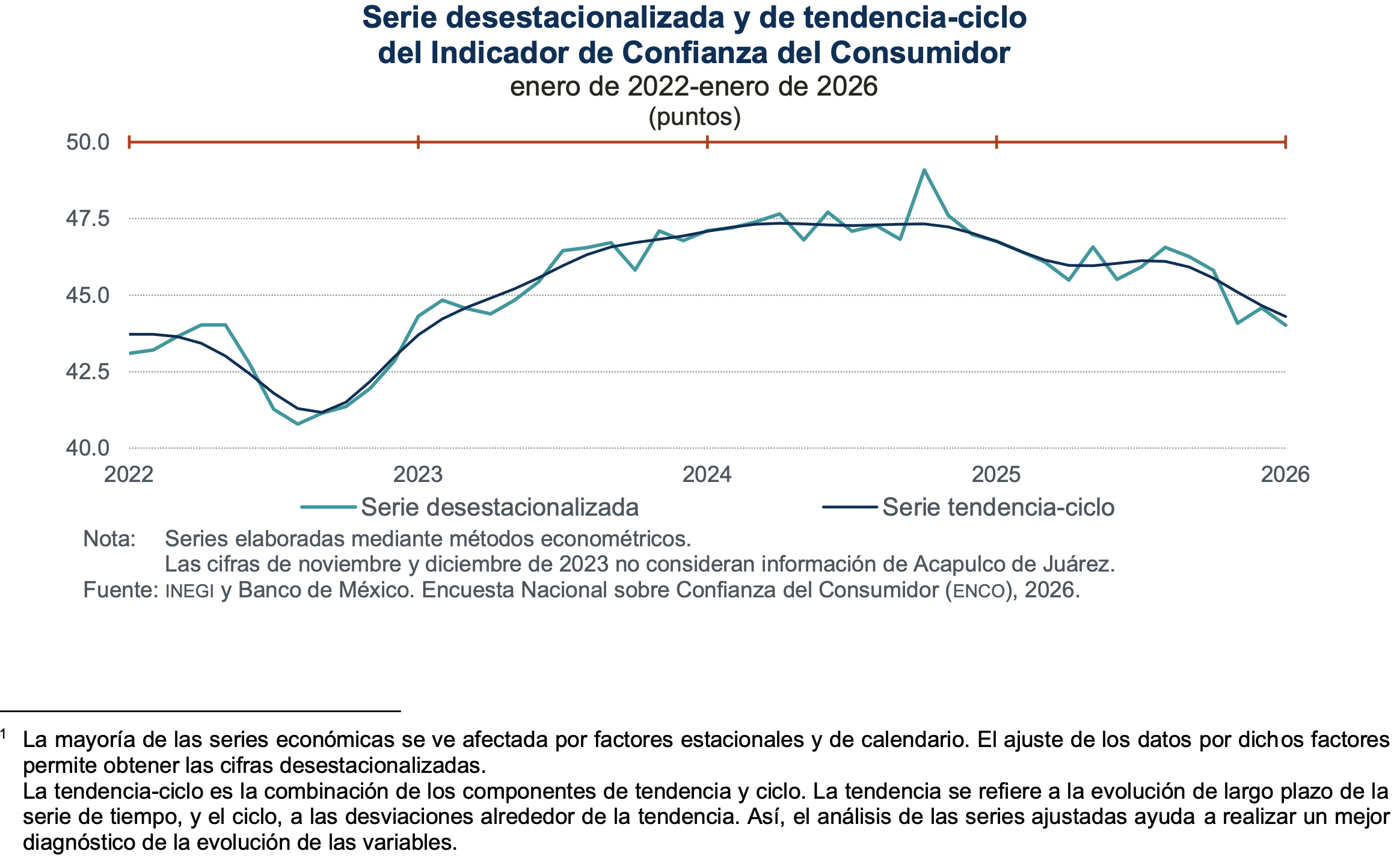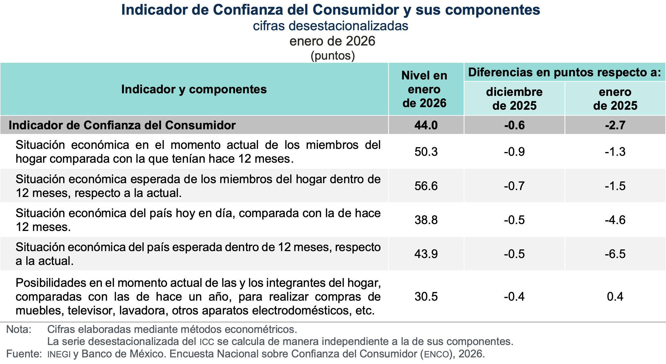 Durante enero de 2026, el Indicador de Confianza del Consumidor (ICC) regitró una baja de 0.6 puntos mensual con datos ajustados por estacionalidad, la tendencia a la baja se extiende por año, informó el Instituto Nacional de Estadística y Geografía (Inegi) y Banco de México (Banxico), y en el anual, la baja es de 2.7 puntos menos.