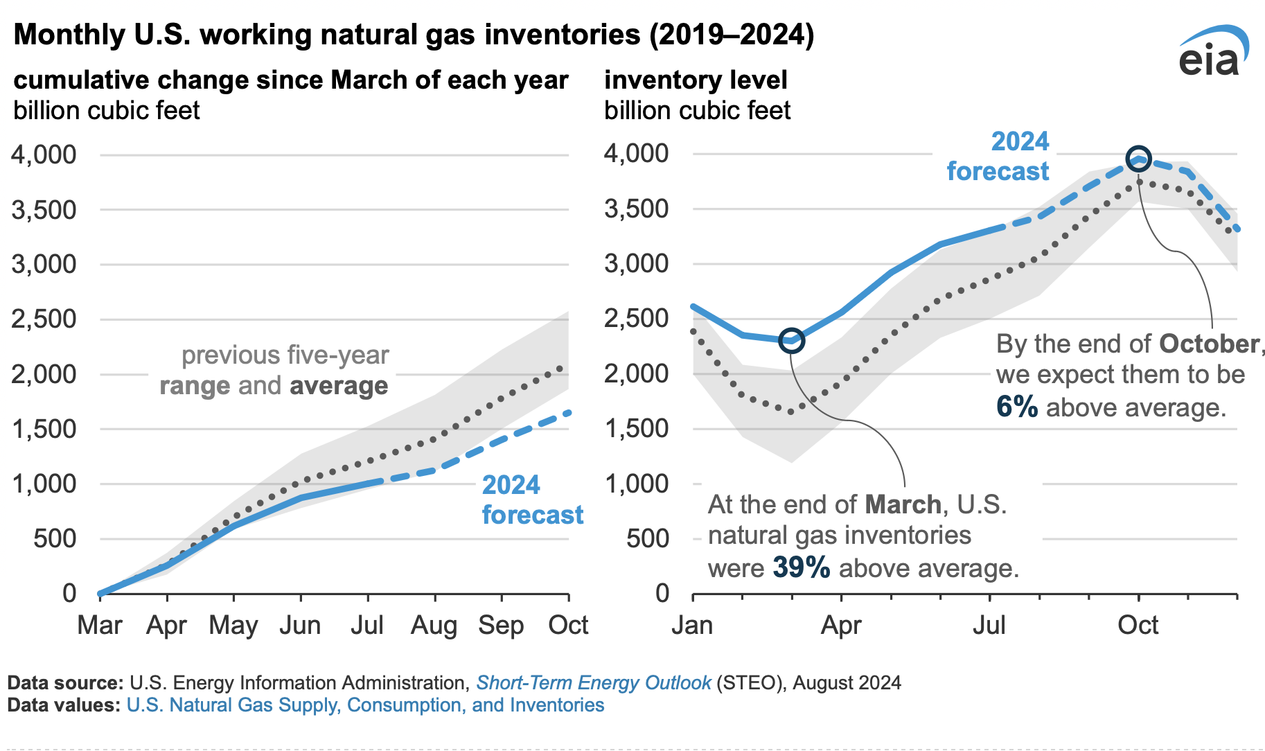 A finales de marzo de 2024, en la época del año en que los inventarios de gas natural a menudo están en su punto más bajo, los inventarios de gas natural de EE. UU. estaban relativamente bien abastecidos. Desde entonces, las inyecciones netas en el almacenamiento de gas natural en funcionamiento en EE. UU. ascendieron a 1,004 Bcf hasta finales de julio, o un 17 % menos que el promedio de marzo a julio durante los cinco años anteriores (2019-23).