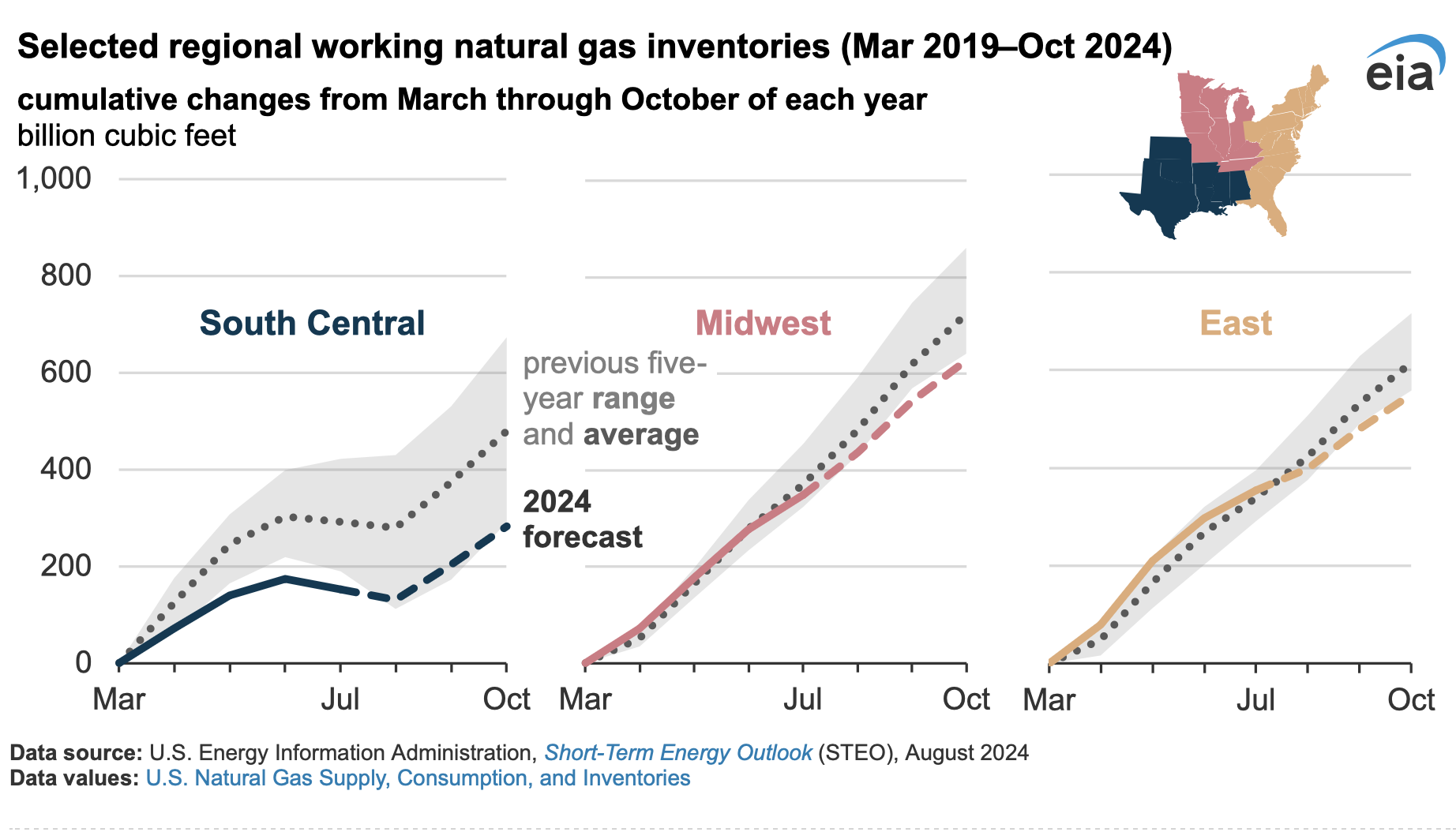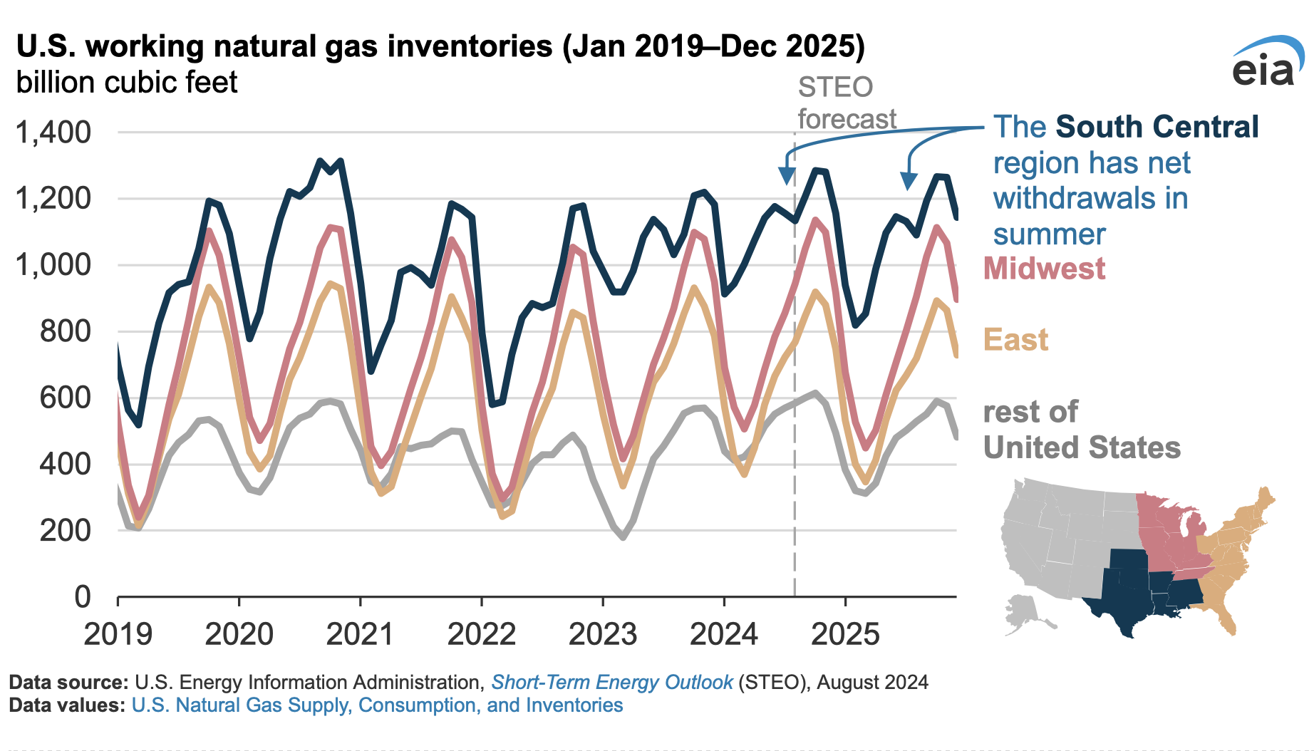 Los inventarios de gas natural en los Estados Unidos siguen un patrón estacional, que generalmente aumenta de abril a octubre, que considera la temporada de inyección, cuando el consumo de gas natural es relativamente bajo. Los inventarios disminuyen de noviembre a marzo, la temporada de retirada, cuando el consumo de gas natural es relativamente alto. Sin embargo, en la región centro-sur, donde se almacena más gas natural que en cualquier otra región, ocasionalmente ve retiros de gas natural en el verano. Algunas de las capacidades de almacenamiento más flexibles de la nación se encuentran en las cavernas de sal de la región centro-sur, que se pueden extraer rápidamente. El patrón estacional único de South Central se ha vuelto más prominente a medida que el uso de gas natural para la generación de energía eléctrica ha aumentado en Texas y los estados circundantes.