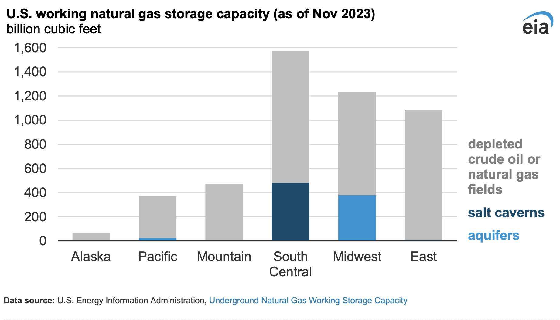 La capacidad de almacenamiento de gas natural en funcionamiento subterráneo en los Estados Unidos ascendió a aproximadamente 4,796 Bcf en mayo de 2024. Alrededor de un tercio de la capacidad de almacenamiento subterráneo de los Estados Unidos se encuentra en la región centro-sur, que se extiende desde Texas y Kansas hasta Alabama. El Medio Oeste representa un 26 % de capacidad, y el Este representa un 23 %. La capacidad de almacenamiento en la región de las montañas, la región del Pacífico y Alaska combinadas resta el 19 % restante.