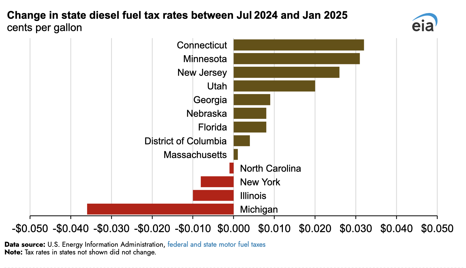 Los impuestos al combustible diésel disminuyeron en cuatro estados, siendo la mayor reducción de impuestos de Michigan de 0.036 dólares. Los impuestos al diésel aumentaron en nueve estados, y Connecticut tuvo el mayor aumento de 0.032 $ a 0.524 $/gal.