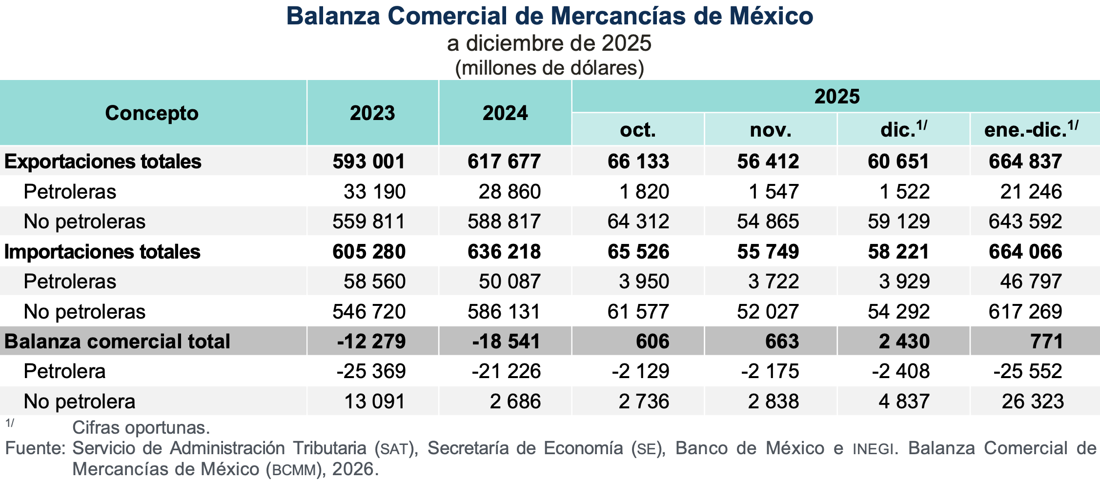 Para 2025, la balanza comercial presentó un superávit de 771 mdd. Este se compara con el déficit de 18 541 mdd observado en 2024. El alza del saldo, entre 2024 y 2025, resultó de un mayor superávit de la balanza de productos no petroleros —que pasó de 2 686 mdd, en 2024, a 26 323 mdd, en 2025— y de un aumento del déficit de la balanza de productos petroleros —que pasó de 21 226 mdd a 25 552 mdd, en esa misma comparación—.