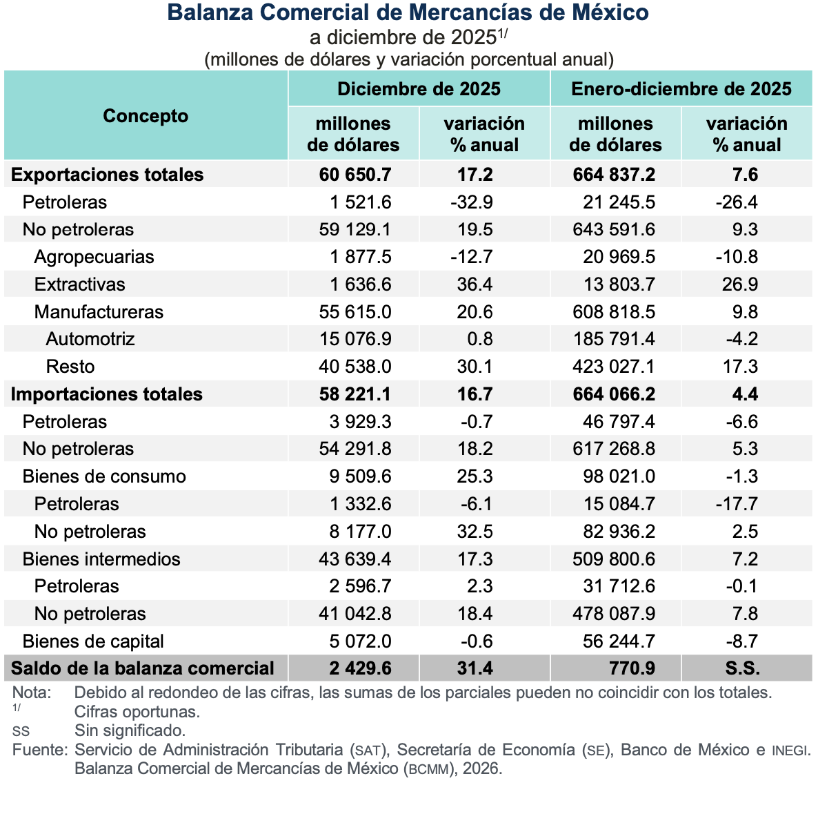 En diciembre de 2025, la información oportuna de comercio exterior registró un superávit comercial de 2 430 millones de dólares (mdd). informó el Instituto Nacional de Estadística y Geografía (Inegi).Dicho saldo se compara con el superávit de 663 mdd reportado en noviembre. El aumento en el superávit comercial, entre noviembre y diciembre de 2025, se originó de un incremento en el superávit de productos no petroleros —que pasó de 2 838 mdd, en noviembre, a 4 837 mdd, en diciembre— y de una ampliación del déficit de la balanza de productos petroleros —que pasó de 2 175 mdd a 2 408 mdd, en esa misma comparación—
