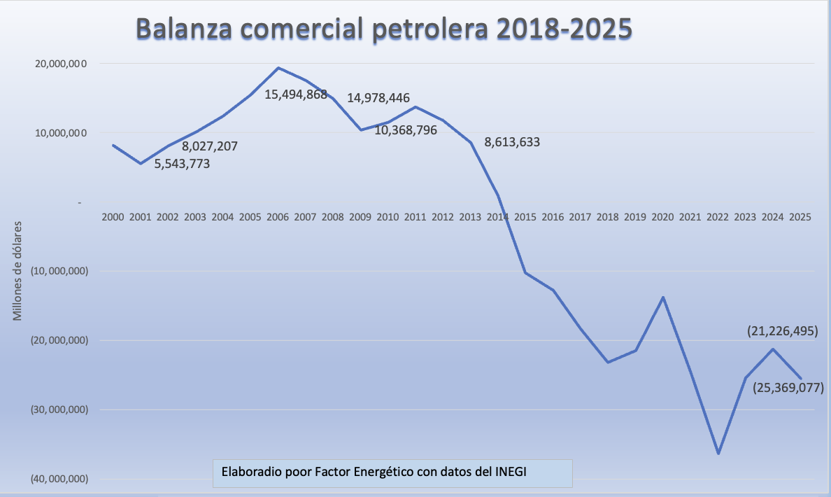 Durante 2025, el déficit comercial petrolero suma 25,552 millones de dólares con un aumento de 20.38% , respecto al 2024, según datos del Instituto Nacional de Estadística y Geografía (Inegi).