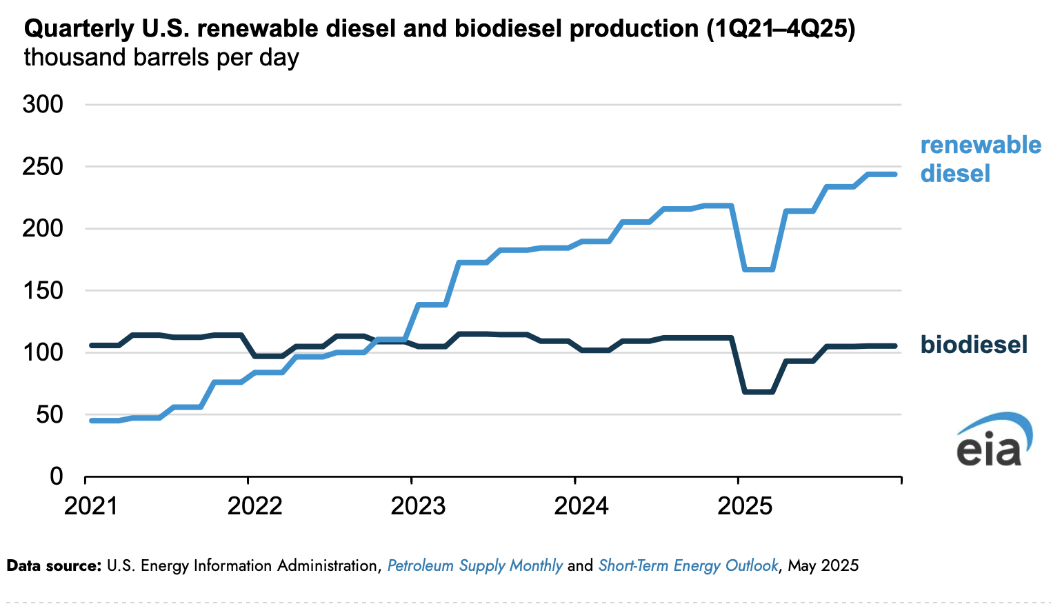 En enero de 2025, la producción estadounidense de biodiésel cayó a 60.000 barriles por día (b/d), el mínimo desde enero de 2015, y alrededor de un 40% menos que en enero de 2024. Los productores de biodiésel de EE. UU. solo aumentaron parcialmente la producción en febrero y marzo, llevando la producción trimestral a alrededor de 70.000 b/d, una disminución de más del 30% con respecto al 1T24.