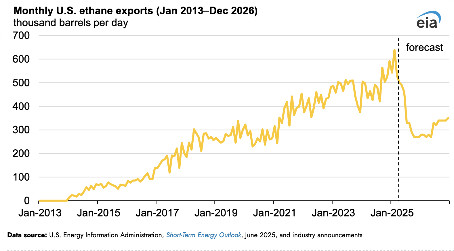 La Administración de Información Energética (EIA, por sus siglas en inglés),  pronostica que las exportaciones de etano de EE. UU. disminuirán en 80,000 barriles por día (b/d) este año y en 177,000 b/d en 2026 revelan las Perspectivas Energéticas a Corto Plazo de junio debido a los nuevos requisitos de licencia para las exportaciones de etano de EE. UU. a China. Cualquier cambio de política que relaje los requisitos de licencia, como el resultado de las negociaciones comerciales entre los Estados Unidos y China, llevaría a aumentar las previsiones para las exportaciones de etano de los Estados Unidos nuevamente.