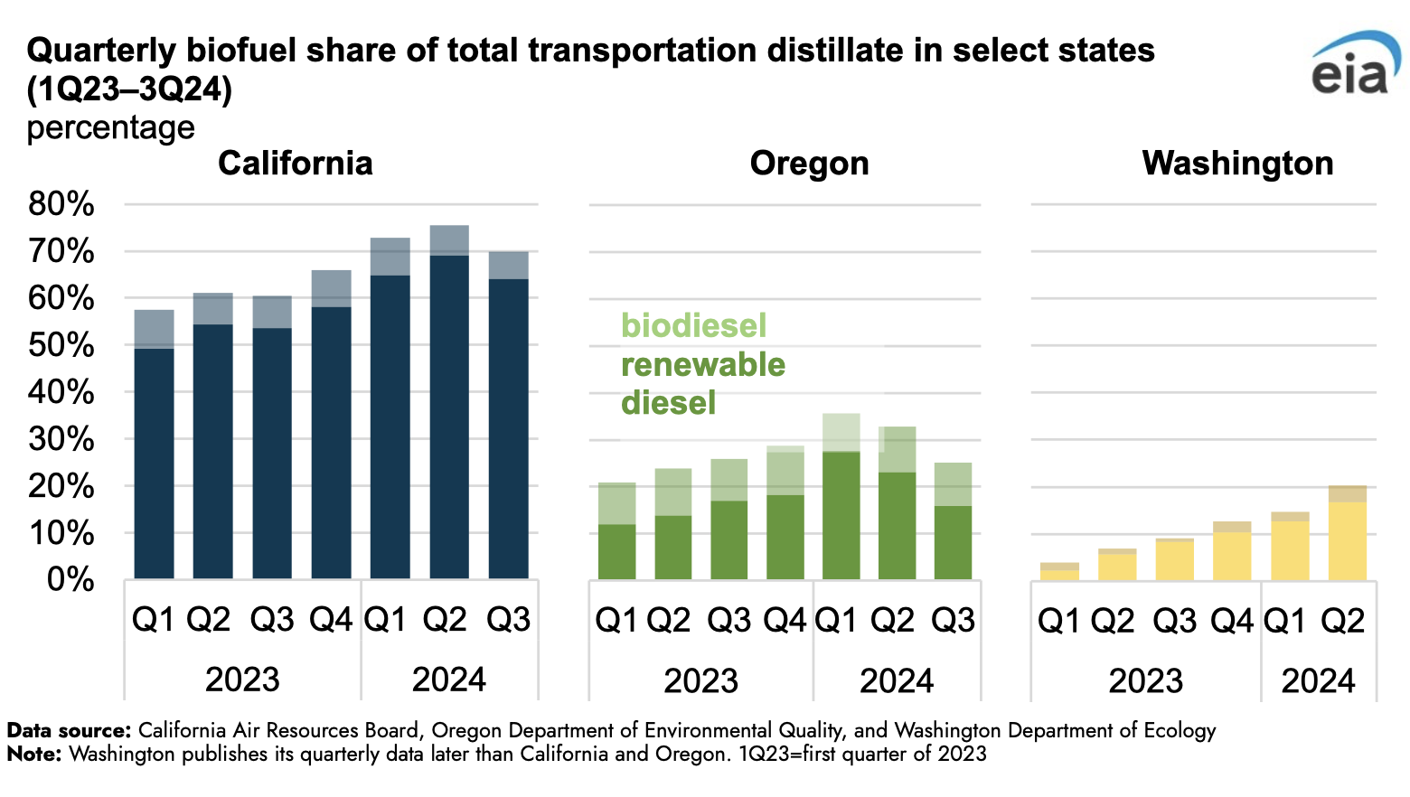 El diésel renovable está reemplazando cada vez más al diésel de petróleo en Costa oeste de los EE. UU., donde las políticas a nivel estatal están atrayendo nueva capacidad de producción y envíos a la región. El combustible se sigue consumiendo principalmente en California, pero también está consumiendo una parte sustancial de las reservas de destilados más pequeñas de Oregón y Washington, según datos trimestrales publicados por California, Oregón y Washington.