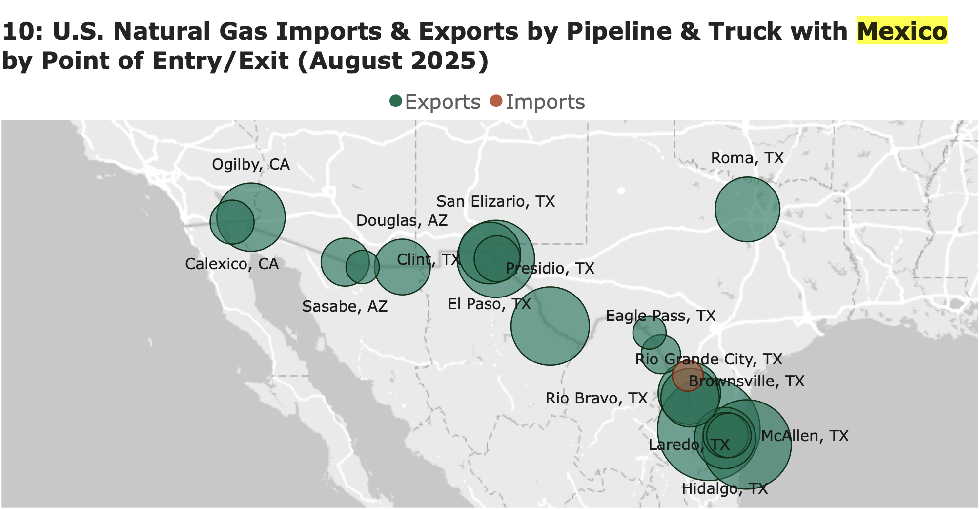 De acuerdo con el reporte mensual, Natural Gas Imports and Exports Monthly Report de agosto, los principales puntos de entrada del hidrocarburo, son: Rio Grande City TX, con 56 MMpc (24%); Brownsville TX, 37 MMpc (16%); Presidio TX, 25 MMpc (11%); San Elizario TX, 24 MMpc (10%); y , Ogilby, CA, con 15 MMpc (75%), juntos suman el 68% del total.