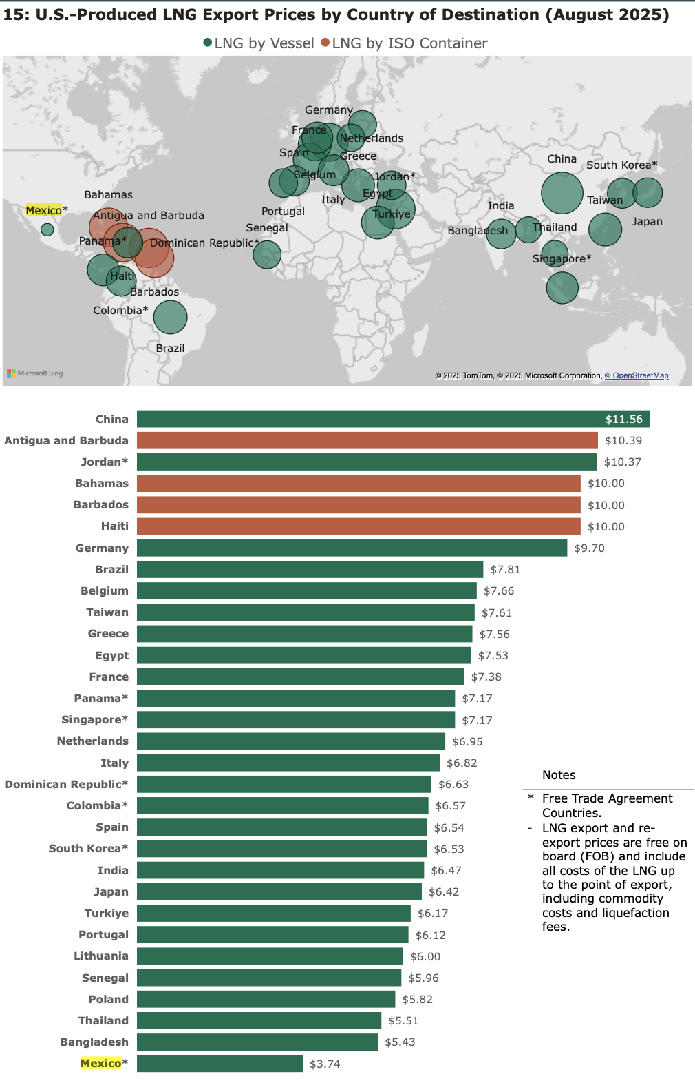 México, que tiene tratado comercial con Estados Unidos, importó gas natural por buque en agosto a un precio de 3.74 dólares MMBtu, el precio más bajo de todos los países. El precio más alto es para China de 11.56 dólares MMBtu. A Colombia, que también tiene tratado comercial lo compró a 6.57 dólares.