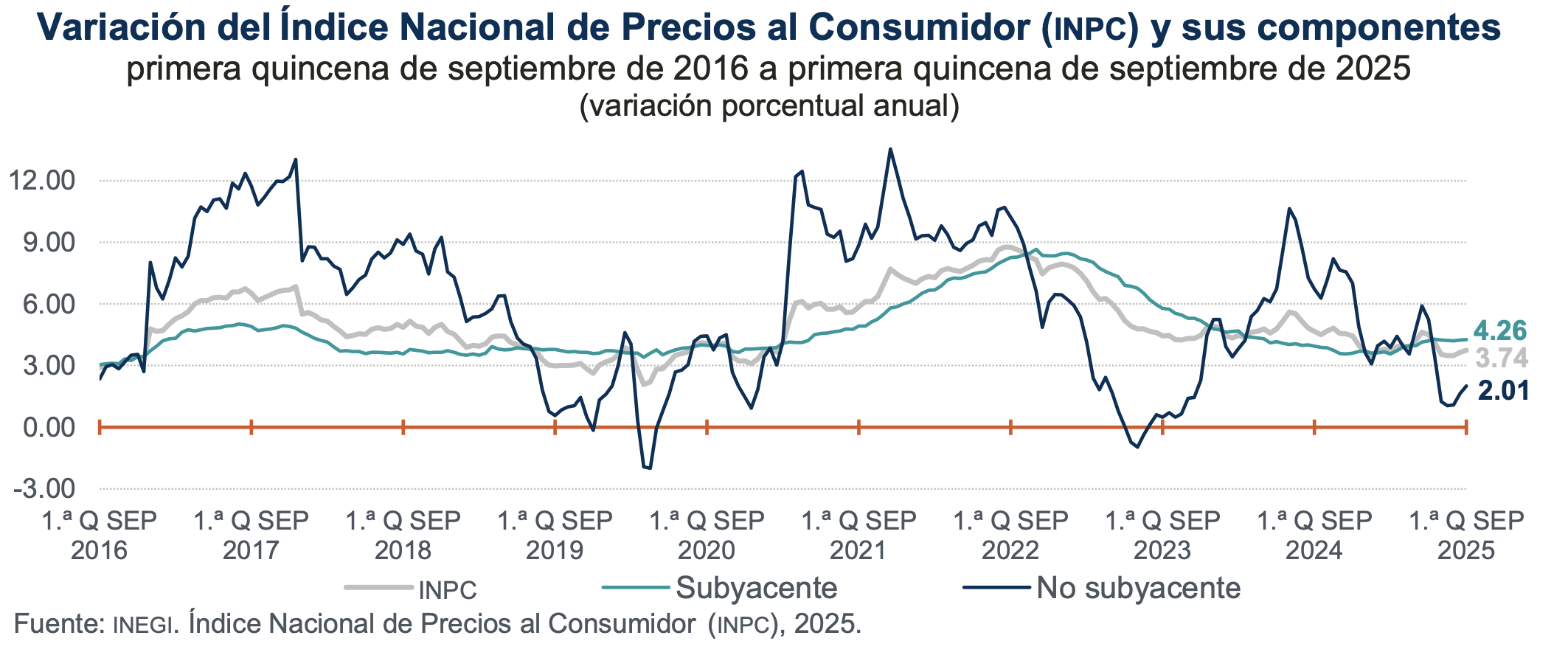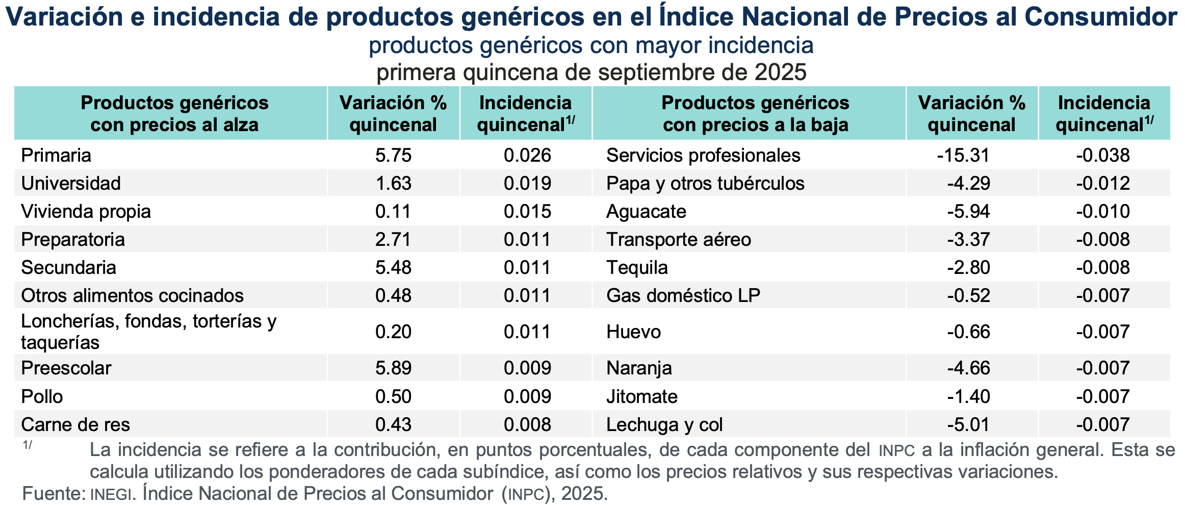 Durante la primera quincena de septiembre de 2025, la inflación al consumidor creció 3.74% anual, mientras que índice subyacente se expandió 4.26%, según Información del Inegi. La variación quincenal fue notablemente impulsada por servicios educativos, lo cual se usual cada año por el inicio del ciclo escolar
