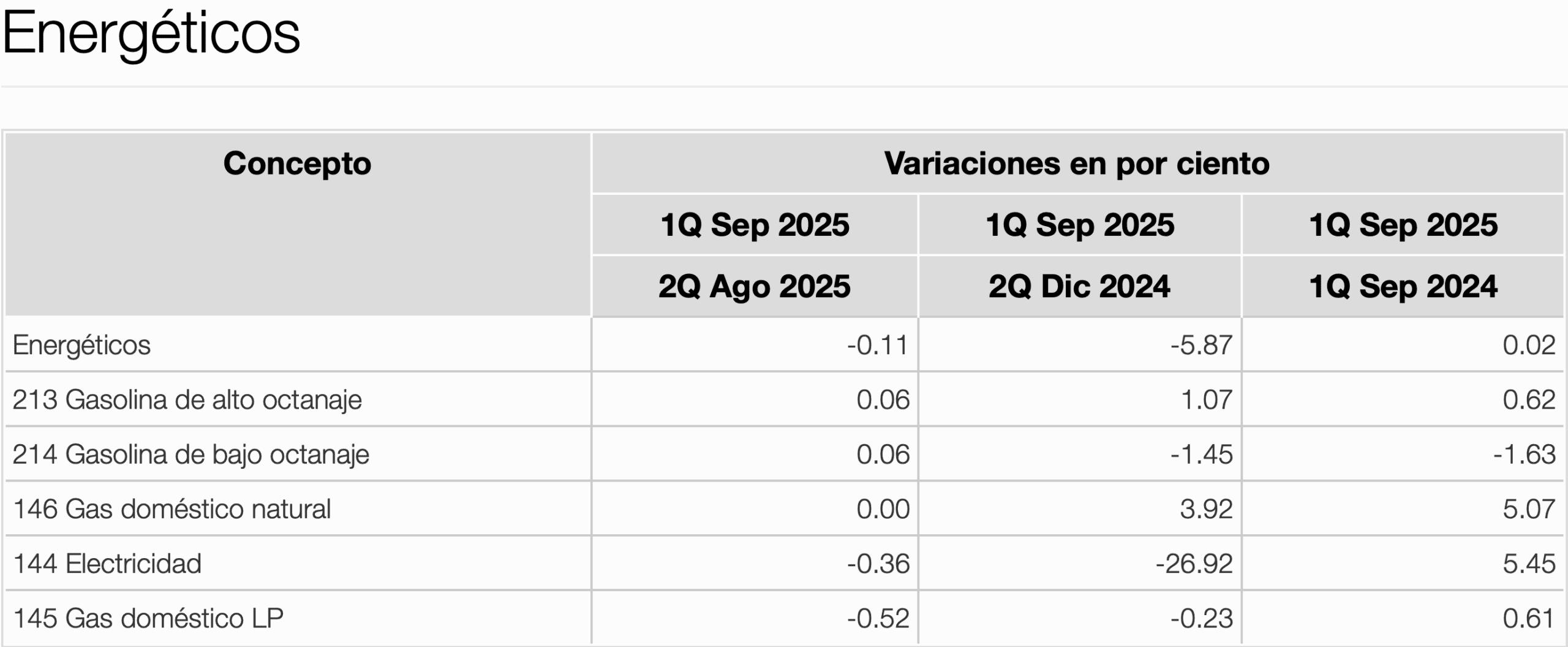 En lo que va de 2025, la electricidad registra una caída en las tarifas de -26.92%; la gasolina de bajo octanaje reporta una baja de -1.45%, y el gas doméstico LP con –0.23%. En contraste, el gas doméstico natural subió 3.92% y la gasolina de alto octanaje 1.07%. Los precios energéticos en promedio reportan una baja promedio de 5.87%.