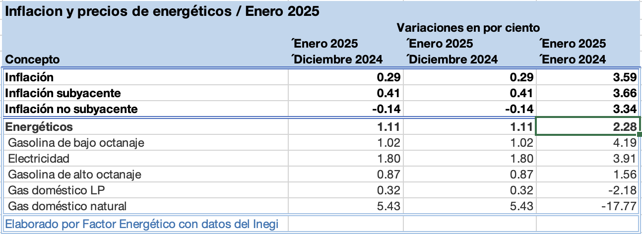 En el inicio del 2025, los precios de los energéticos es un factor de presión a la inflación. El Indice Nacional de Precios al Consumidor subió 0.29% en enero, mientras que los precios de los energéticos se incrementaron 1.11%, casi cuatro veces el promedio general.