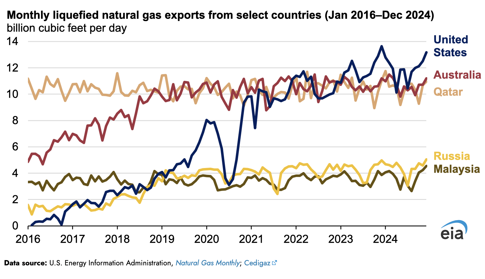 Estados Unidos exportó 11,900 millones de pies cúbicos por día (Bcf/d) de gas natural licuado (GNL) en 2024, siendo el mayor exportador de GNL del mundo. Las exportaciones de GNL de Australia y Qatar, los dos mayores exportadores de GNL del mundo, se han mantenido relativamente estables en los últimos cinco años (2020-24); sus exportaciones han oscilado entre 10.2 Bcf/d y 10.7 Bcf/d anualmente, según datos de Cedigaz. Rusia y Malasia han sido los cuartos y quintos mayores exportadores de GNL a nivel mundial desde 2019. En 2024, las exportaciones de GNL de Rusia promediaron 4.4 Bcf/d, y las exportaciones de Malasia promediaron 3.7 Bcf/d, indica un análisis de la Administración de Información Energética (EIA, por sus siglas en inglés).