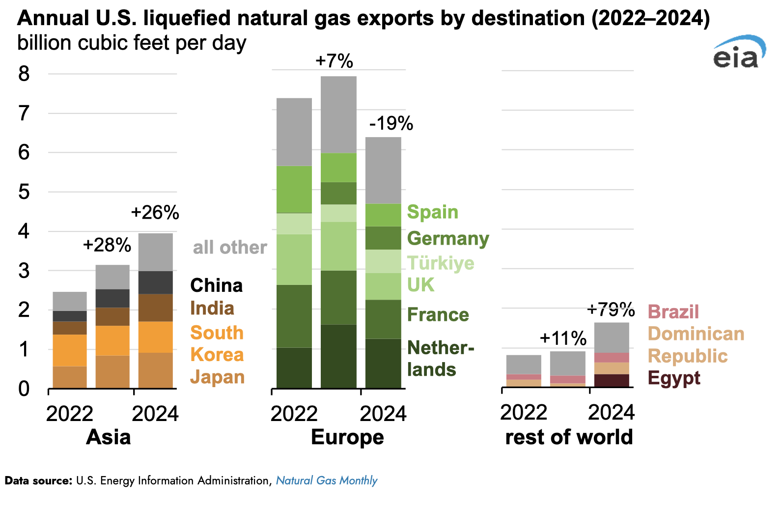 Las terminales de GNL que operaban en 2024 promediaron el 104 % de la capacidad nominal y el 86 % de la capacidad máxima, sin cambios con respecto al año anterior. Mientras que Europa (incluida Türkiye) siguió siendo el destino principal para los Estados Unidos. Exportaciones de GNL en 2024, que representan el 53 % (6.3 Bcf/d) del total de las exportaciones de EE. UU. Las exportaciones de GNL a Asia aumentaron del 26 % (3.1 Bcf/d) en 2023 al 33 % (4.0 Bcf/d) en 2024. . Las exportaciones de GNL a otras regiones, incluidos Oriente Medio, África del Norte y América Latina, también aumentaron el año pasado y representaron el 14 % (1.6 Bcf/d) de las exportaciones totales, en comparación con el 8 % (0.9 Bcf/d) en 2023.
