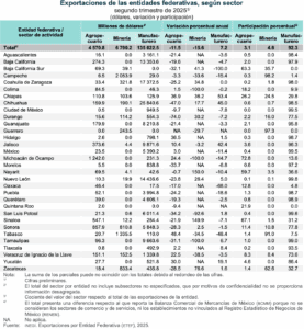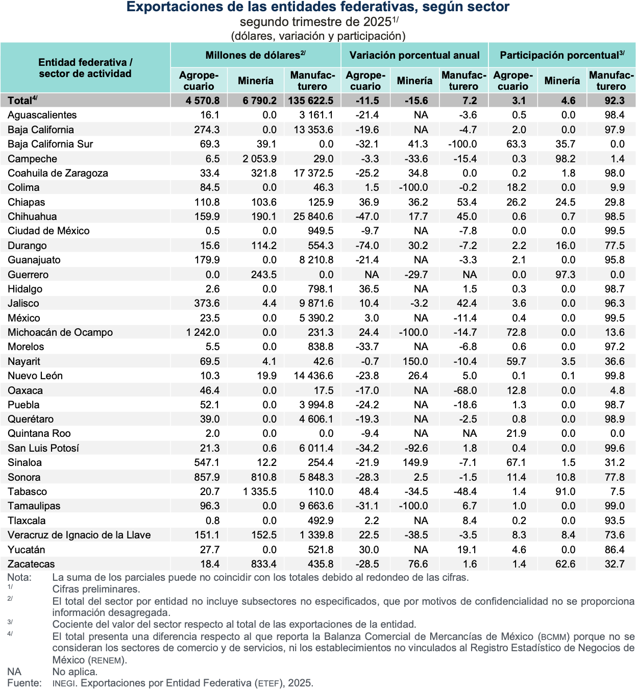 En el trimestre abril-junio de 2025, por sector de actividad económica, las exportaciones manufactureras representaron 92.3 % del valor total de las exportaciones de las entidades federativas. Siguieron las de minería (petrolera y no petrolera), con 4.6 %, y las del sector agropecuario, con 3.1 por ciento.