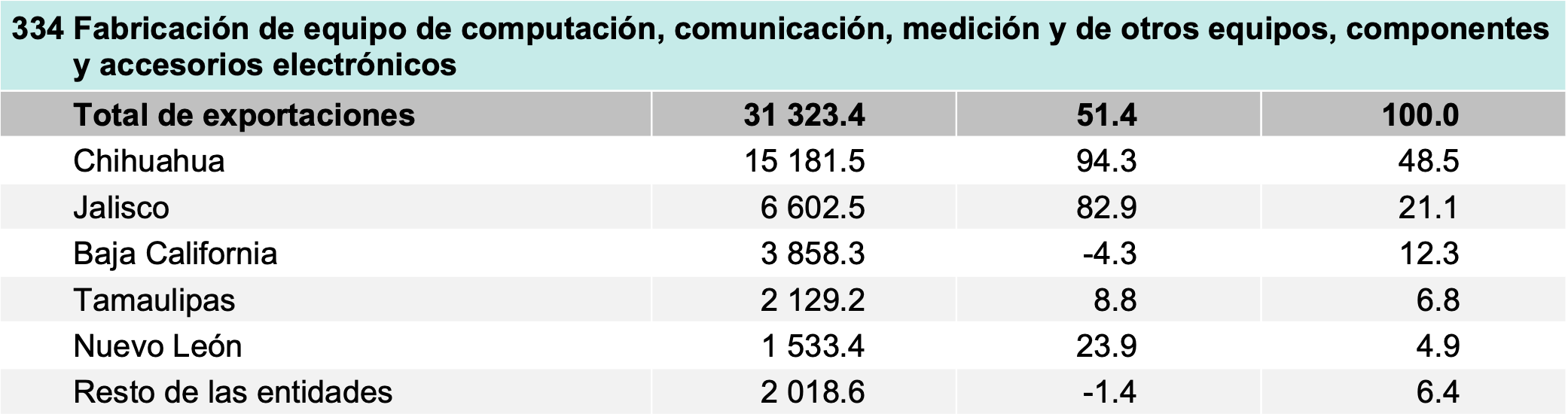 Los estados más beneficiados con el dinamismo del sector son: Chihuahua y Jalisco que contribuyeron con 15,1881. y 6,602.5 millones de dólares, con crecimientos anuales de 94.3% y 82.9%, cada uno. Baja California que contribuyó con 3,853 millones dólares, reportó una baja de -4.3%, pero todavía participa con el 12.3% del total.
