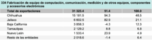 Durante el segundo trimestre de 2025, la exportaciones de equipo de computación, comunicación, medición y de otros equipos, componentes y accesorios electrónicos sumaronn 31,323 millones de dólares, lo que representó un aumento de 51.4% anual, lo que significó el sector co mayor dinamismo el periodo, según información del Instituto Nacional de Estadística y Geografía (Inegi).