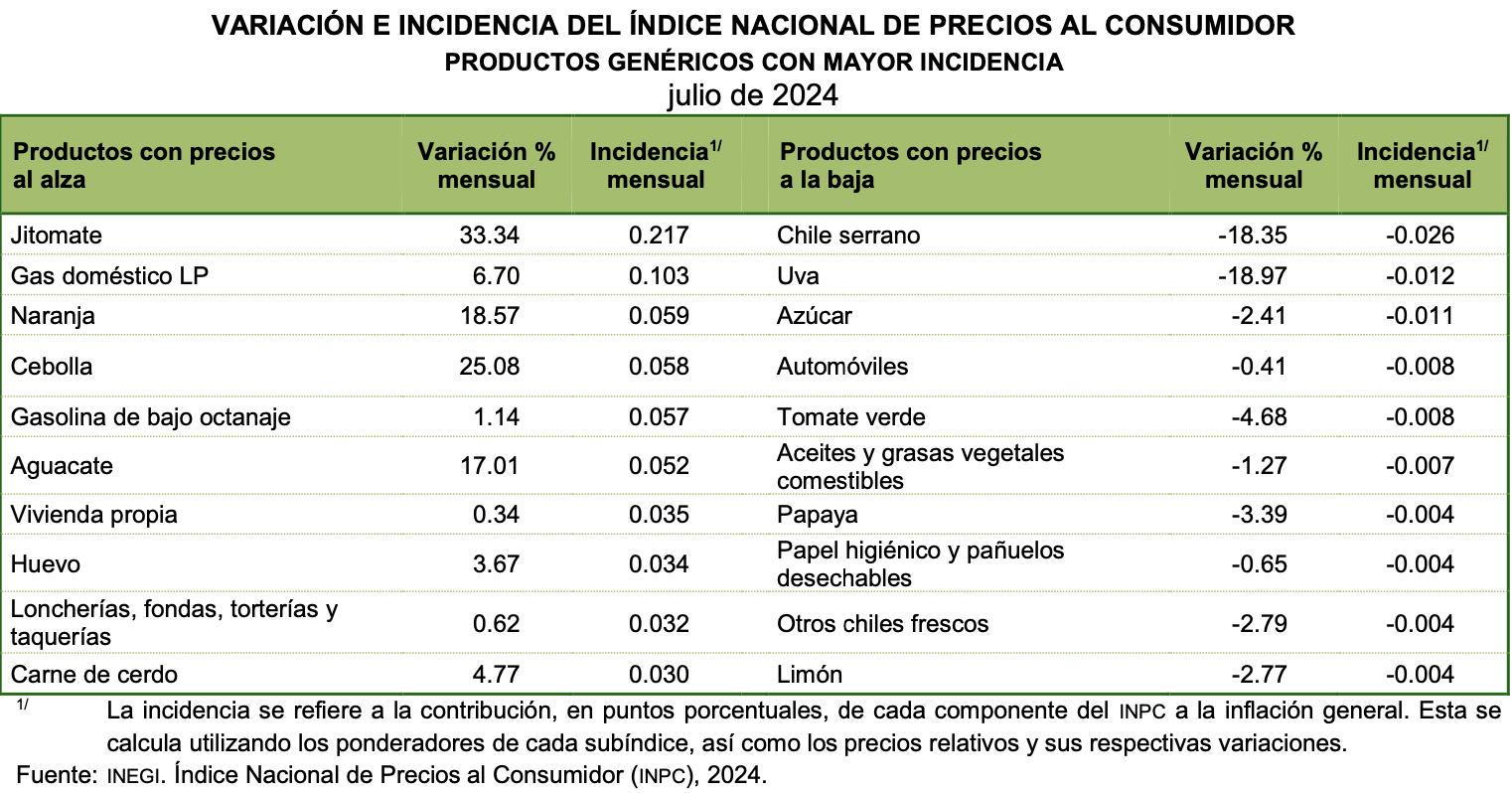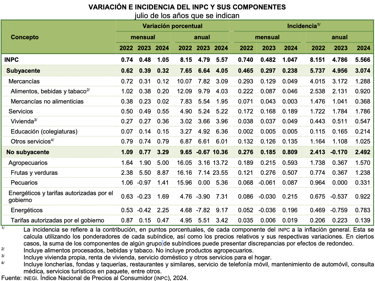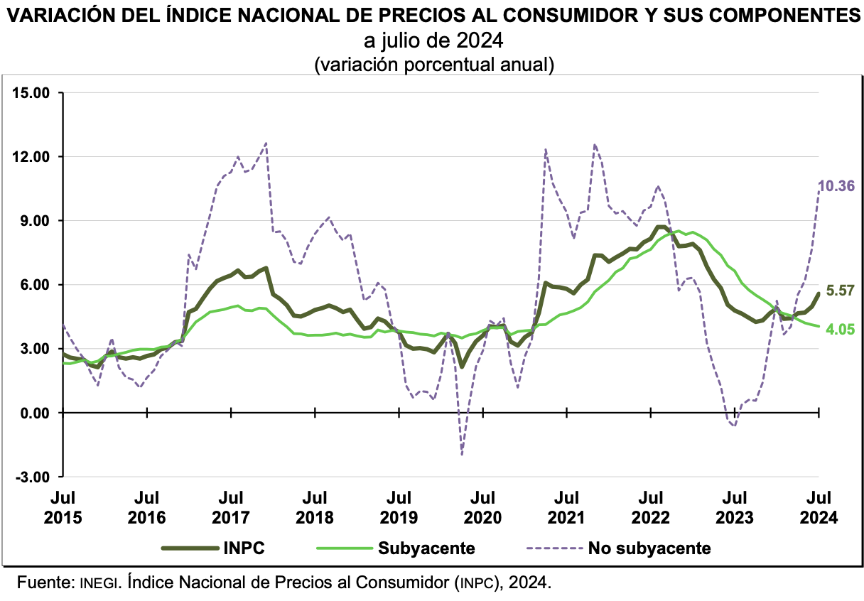 En julio de 2024, el Indice Nacional de Precios al Consumidor (INPC) presentó un aumento de 1.05 % respecto al mes anterior. Con este resultado, la inflación general anual se ubicó en 5.57 por ciento. En el mismo mes de 2023, la inflación mensual fue de 0.48 % y la anual, de 4.79 por ciento.