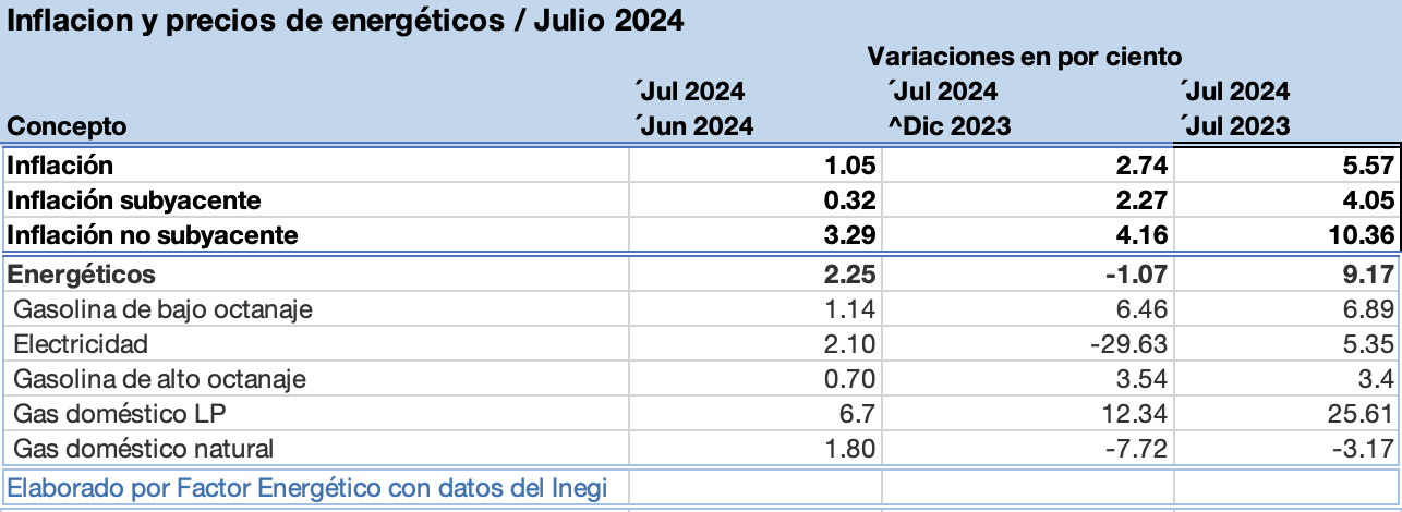 En el séptimo mes del año, las mayores alzas de precios en los productos energéticos son: gas doméstico LP, 6.70%; electricidad, 2.10%; gas doméstico natural, 1.80%; gasolina de bajo octanaje, 1.10%; y la gasolina de alto octanaje, 0.70%.