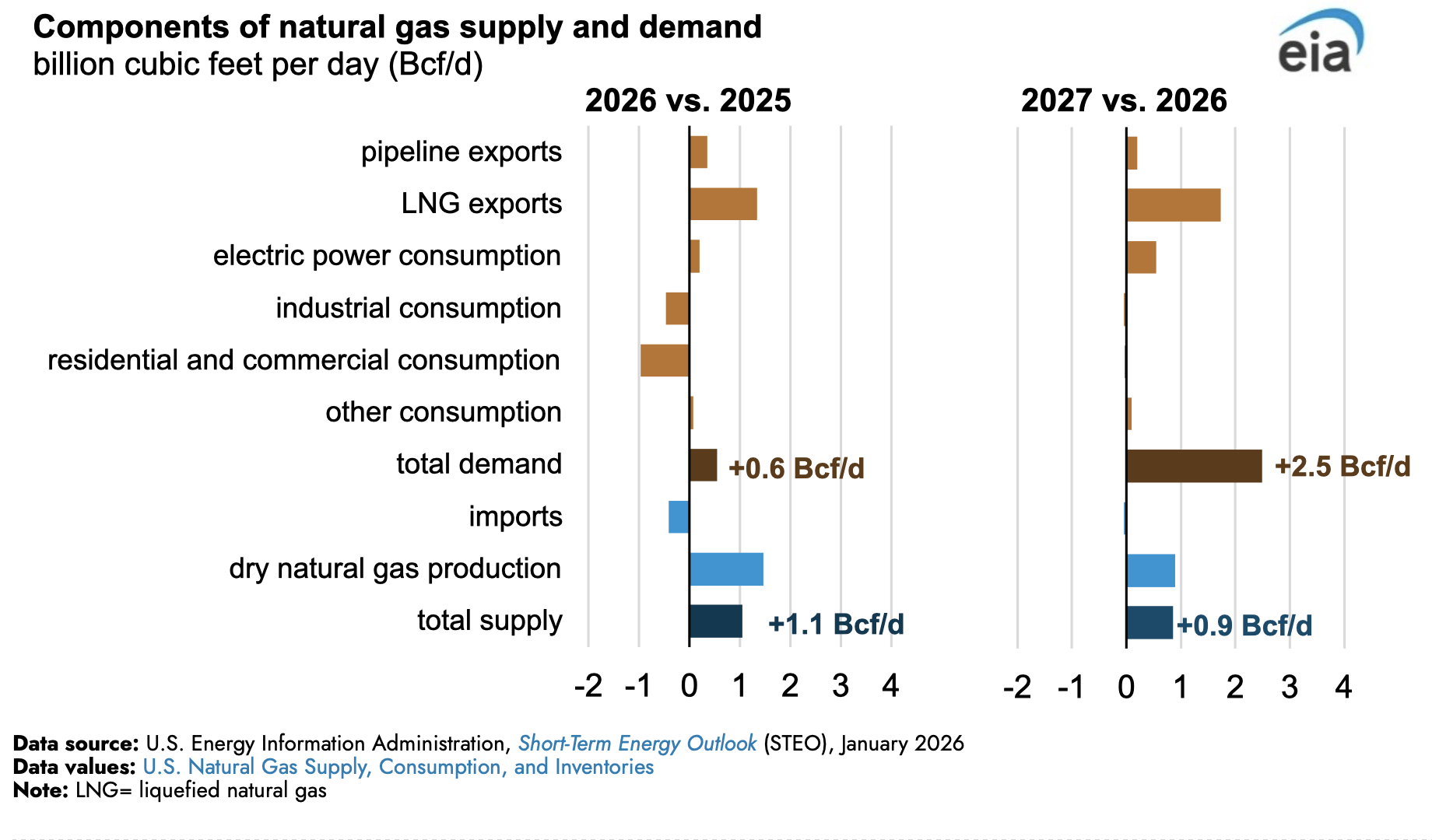 El crecimiento de la oferta de gas natural podría superar el crecimiento de la demanda en 0.500 millones de pies cúbicos por día (Bcf/d) en 2026, pero luego se podría retraer en 1.6 Bcf/d en 2027, lo que ejercerá presión al alza sobre los precios del gas natural. Se prevé que la demanda en 2026, que incluye las exportaciones, aumentará menos del 1% (+0.6 Bcf/d), mientras que la oferta, que incluye las importaciones, aumentará casi un 1% (+1.1 Bcf/d), esta diferencia se revertirá en 2027, ya que el crecimiento de la demanda (+2.5 Bcf/d) superará el crecimiento de la oferta (+0.9 Bcf/d).