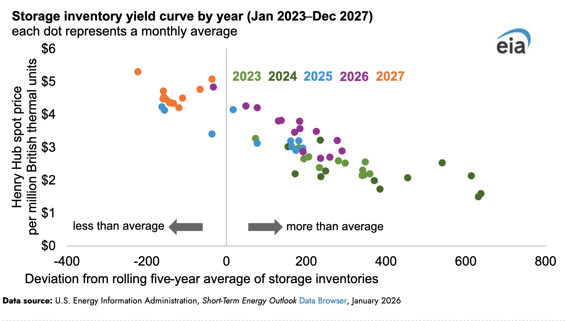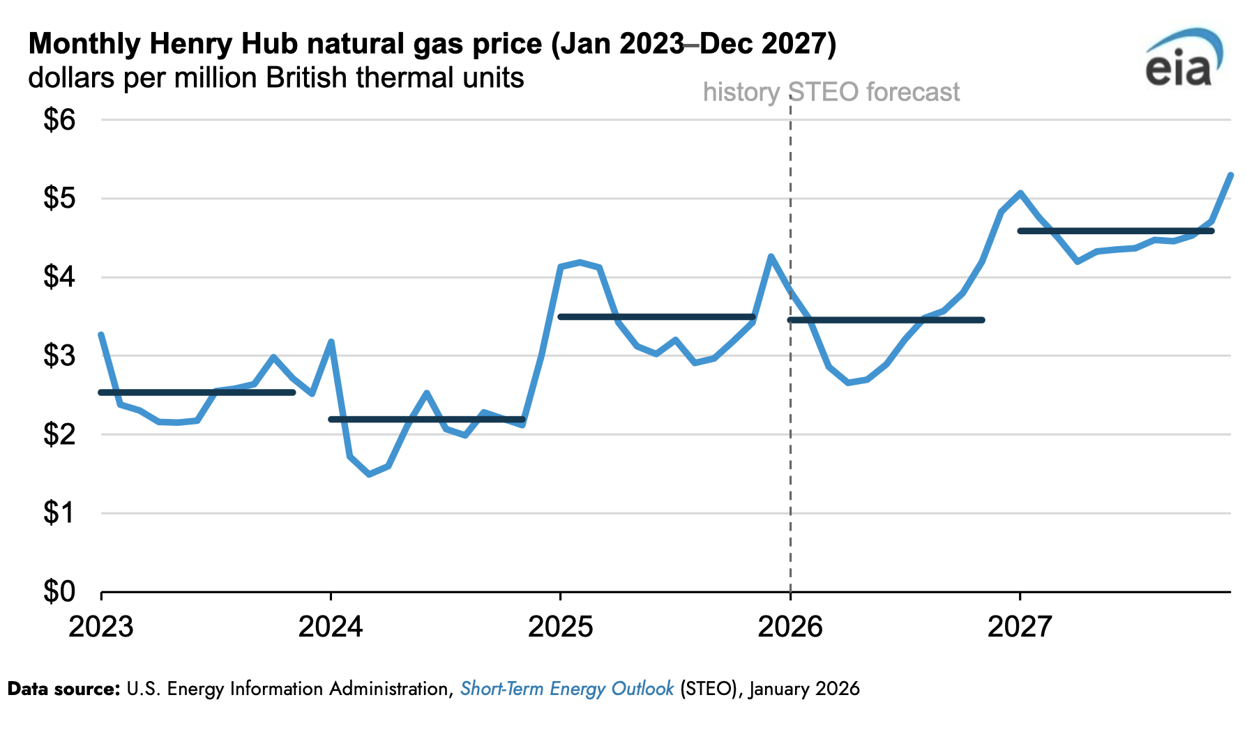 La Administración de Información Energética (AIE, por sus siglas en inglés), prevé que el precio spot de referencia del gas natural estadounidense en el Henry Hub disminuya aproximadamente un 2%, hasta poco menos de 3.50 dólares por millón de unidades térmicas británicas (MMBtu) en 2026, antes de experimentar un fuerte aumento en 2027, hasta alrededor de los  4.60 dólares/MMBtu, según Short-Term Energy Outlook (STEO) de enero.  El precio promedio anual del Henry Hub en 2026 podría disminuir ligeramente, ya que el crecimiento anual de la oferta se mantiene al ritmo del crecimiento de la demanda a lo largo del año. Sin embargo, en 2027, se prevé que el crecimiento de la demanda será más rápido que el de la oferta, impulsado principalmente por una mayor demanda de gas de alimentación de las instalaciones de exportación de gas natural licuado (GNL) de EE. UU., lo que reducirá el gas natural almacenado. Se pronostica que los precios spot promedio anuales disminuirán un 2% en 2026 y luego aumentarán un 33% en 2027.