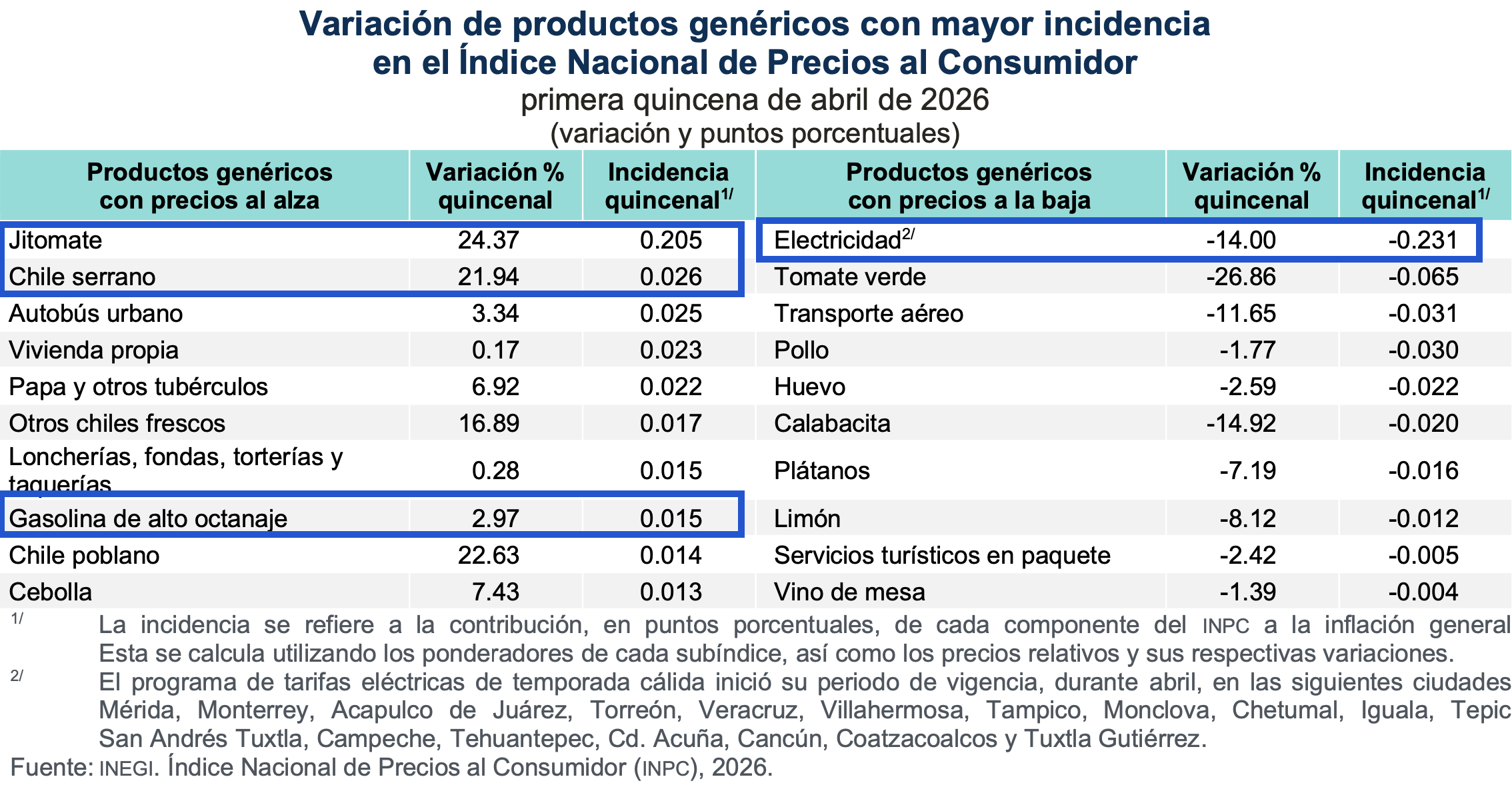 En esta quincena de abril, una información a considerar es que llega la temporada de verano y el gobierno aplica un programa de tarifas bajas de electricidad, por lo que, los precios de la electricidad reportan una baja de 14%, los ajustes a las tarifas eléctricas se aplican en 18 ciudades del país dentro del esquema de temporada cálida.