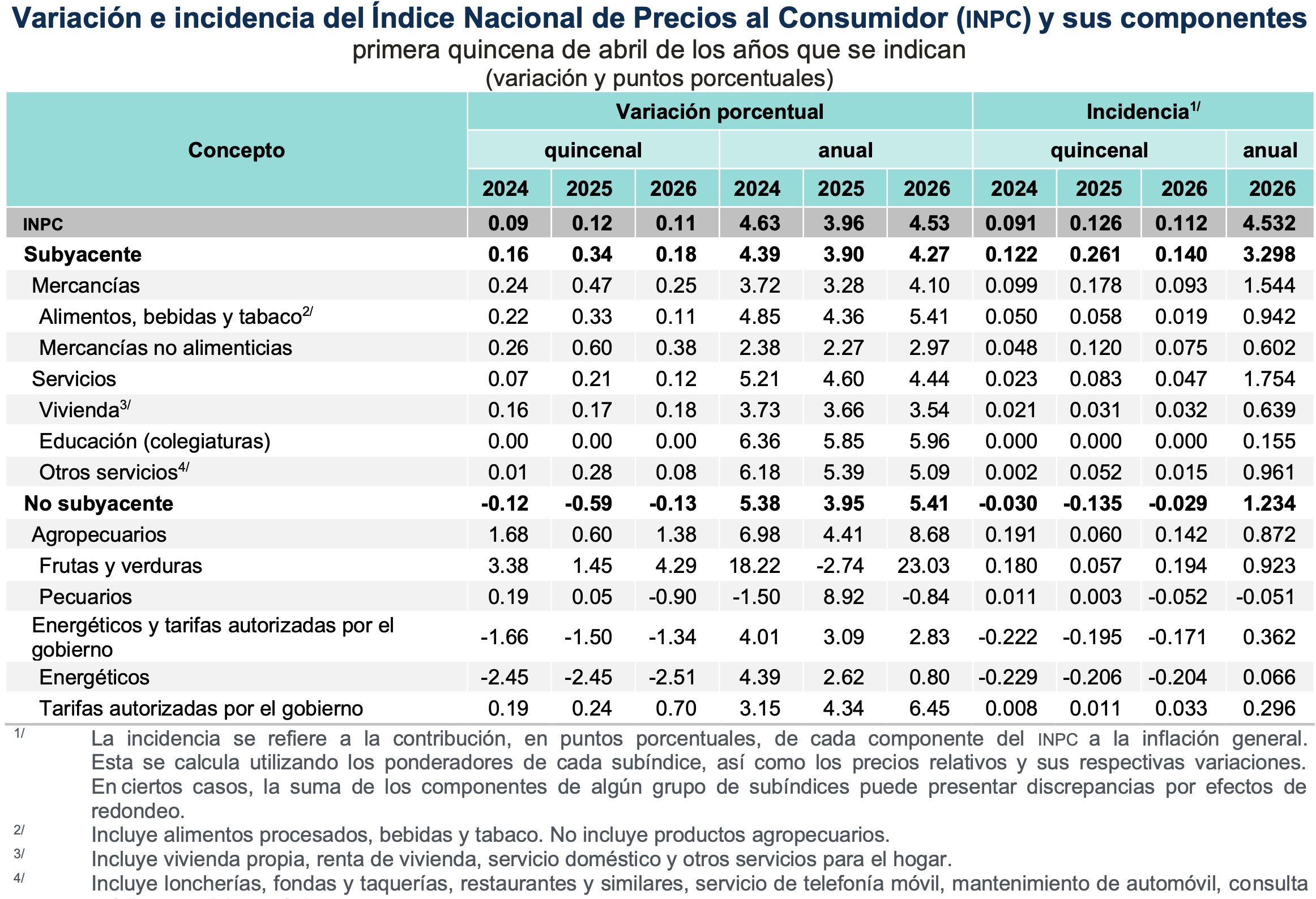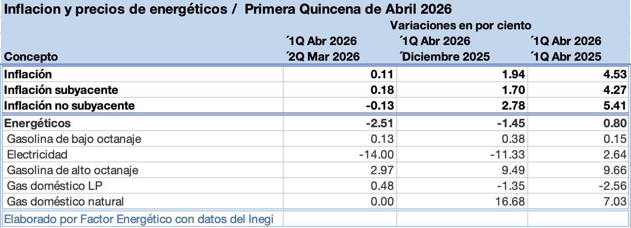 Durante la primera quincena de abril, los energéticos reportan una baja de -2.51º% contra un avance de 0.11% en el Indice Nacional de Precios al Consumidor (INPC), informó el Instituto Nacional de Estadística y Geografía. Con este resultado, la inflación general anual se ubicó en 4.53 por ciento. En el mismo periodo de 2025, la inflación quincenal fue de 0.12 % y la anual, de 3.96 por ciento.
