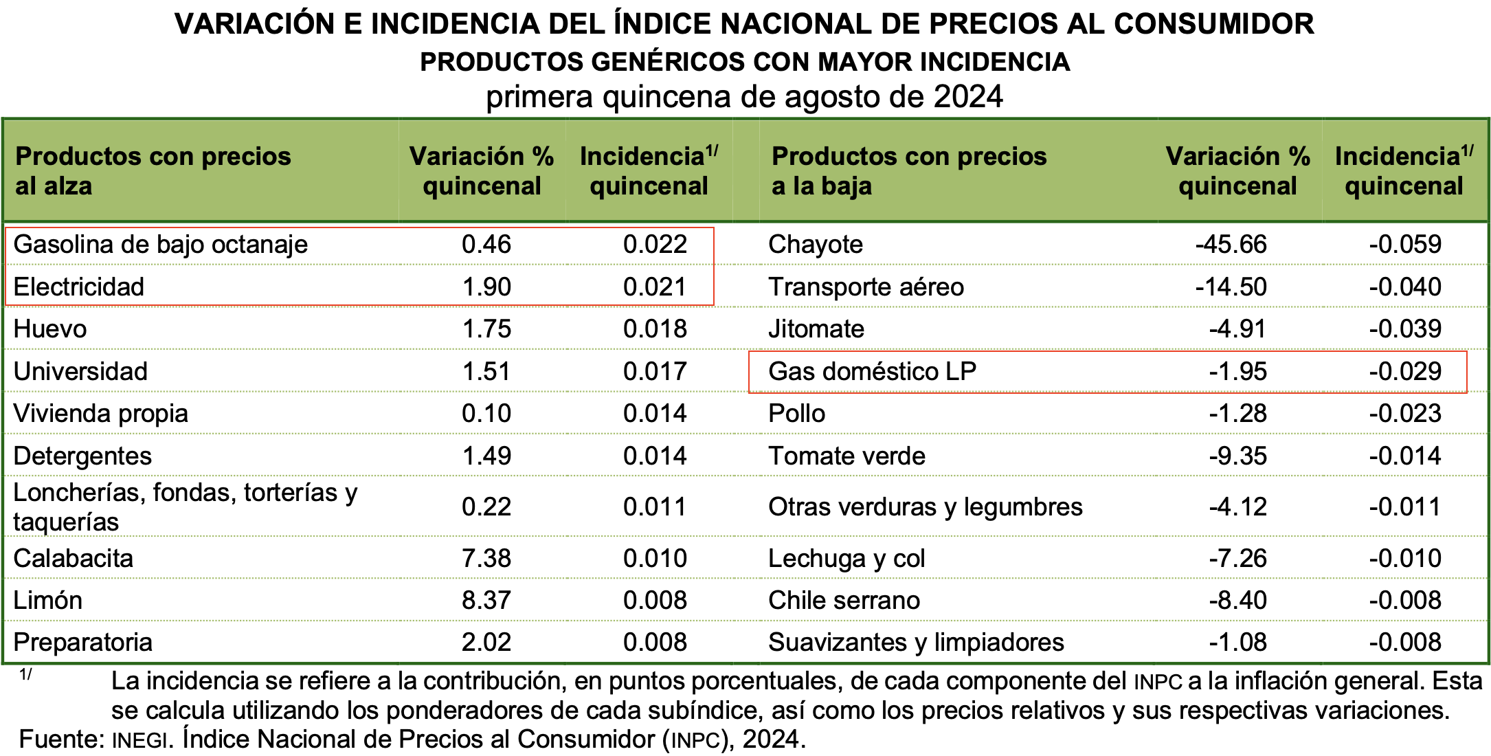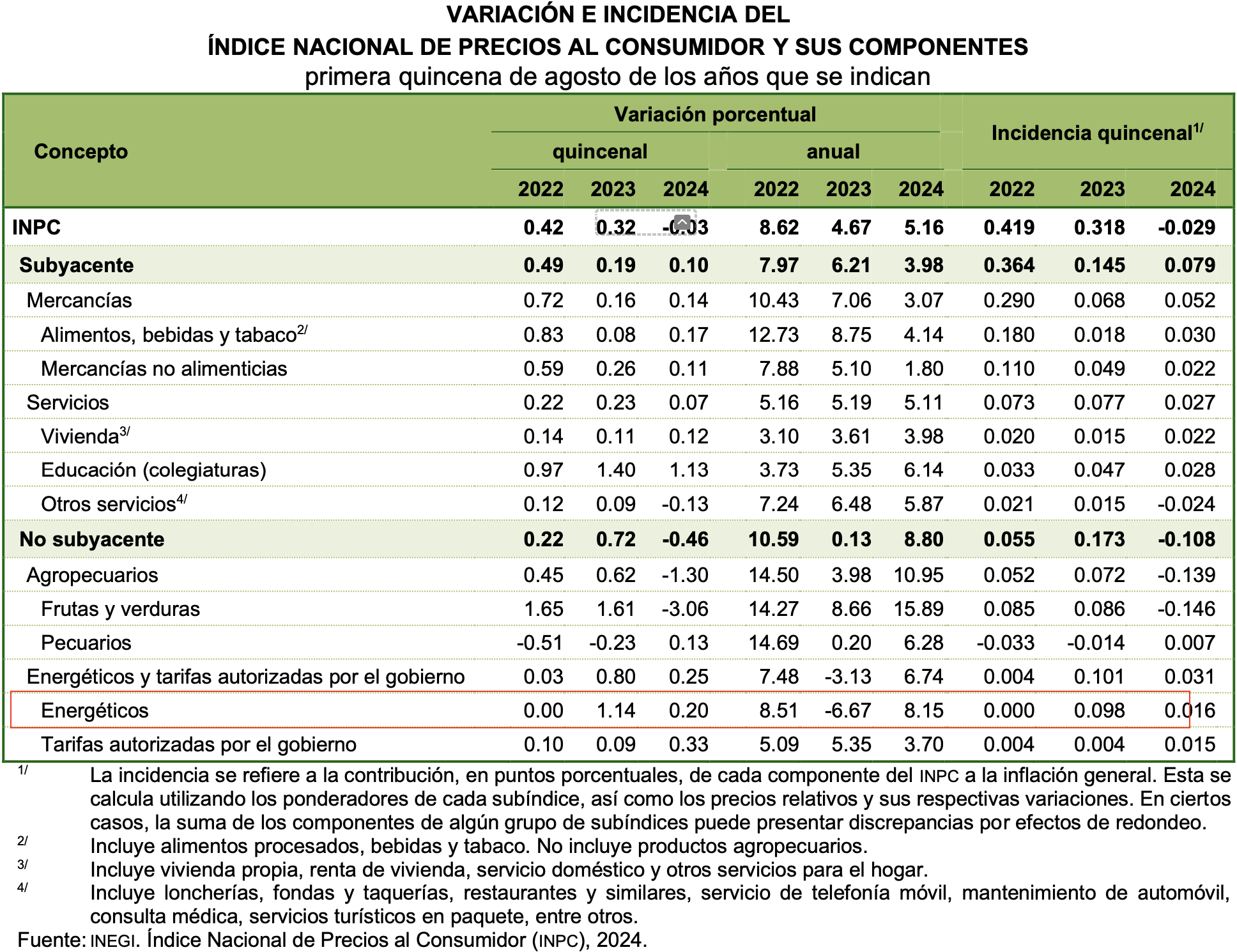 Las tarifas de electricidad que reportan un alza de 1.90% en los primeros quince días de agosto, tuvo una incidencia de 0.021% en INPC. El gas LP que registró una baja en el precio de 1.95%, tuvo una incidencia negativa de -0.029%.