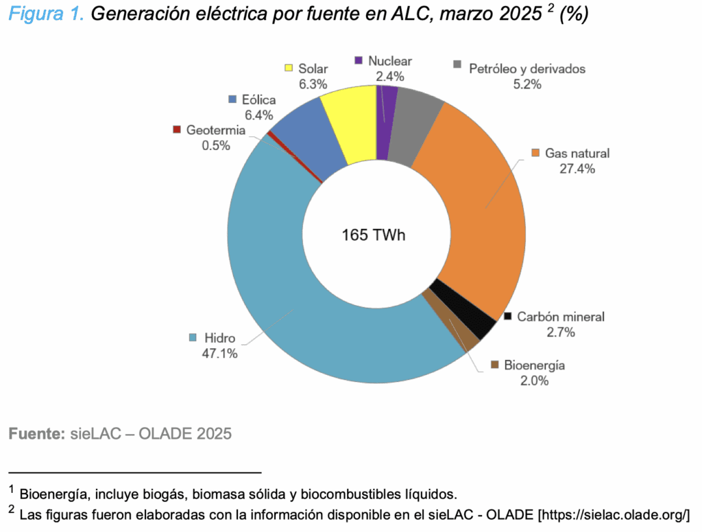 La generación eléctrica en América Latina y el Caribe alcanzó en marzo de 2025 los 165 TWh, el volumen más alto registrado en los últimos 12 meses, y un aumento interanual de 5%, según el último Reporte de Generación Eléctrica de la Organización Latinoamericana de Energía (OLADE).