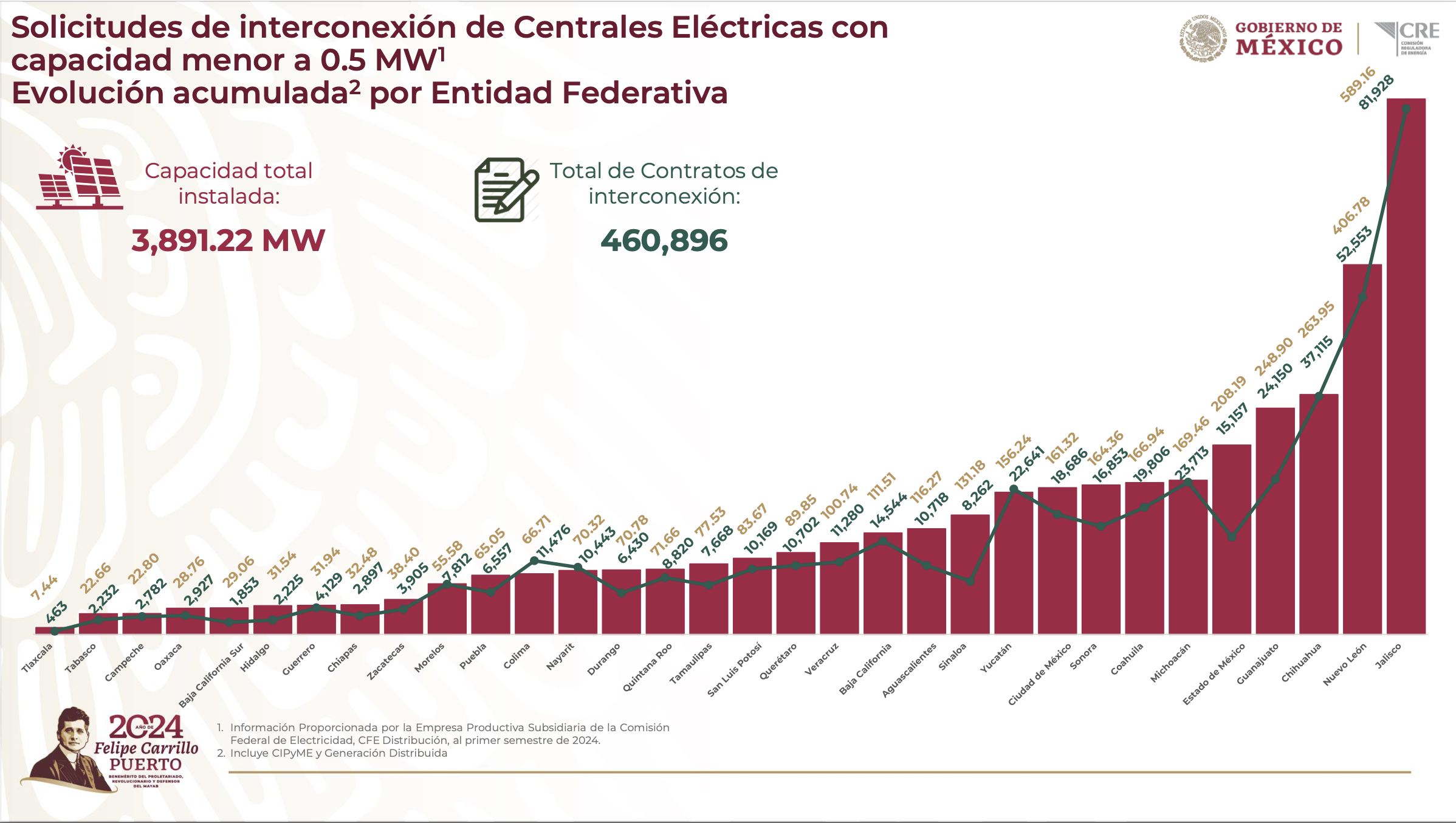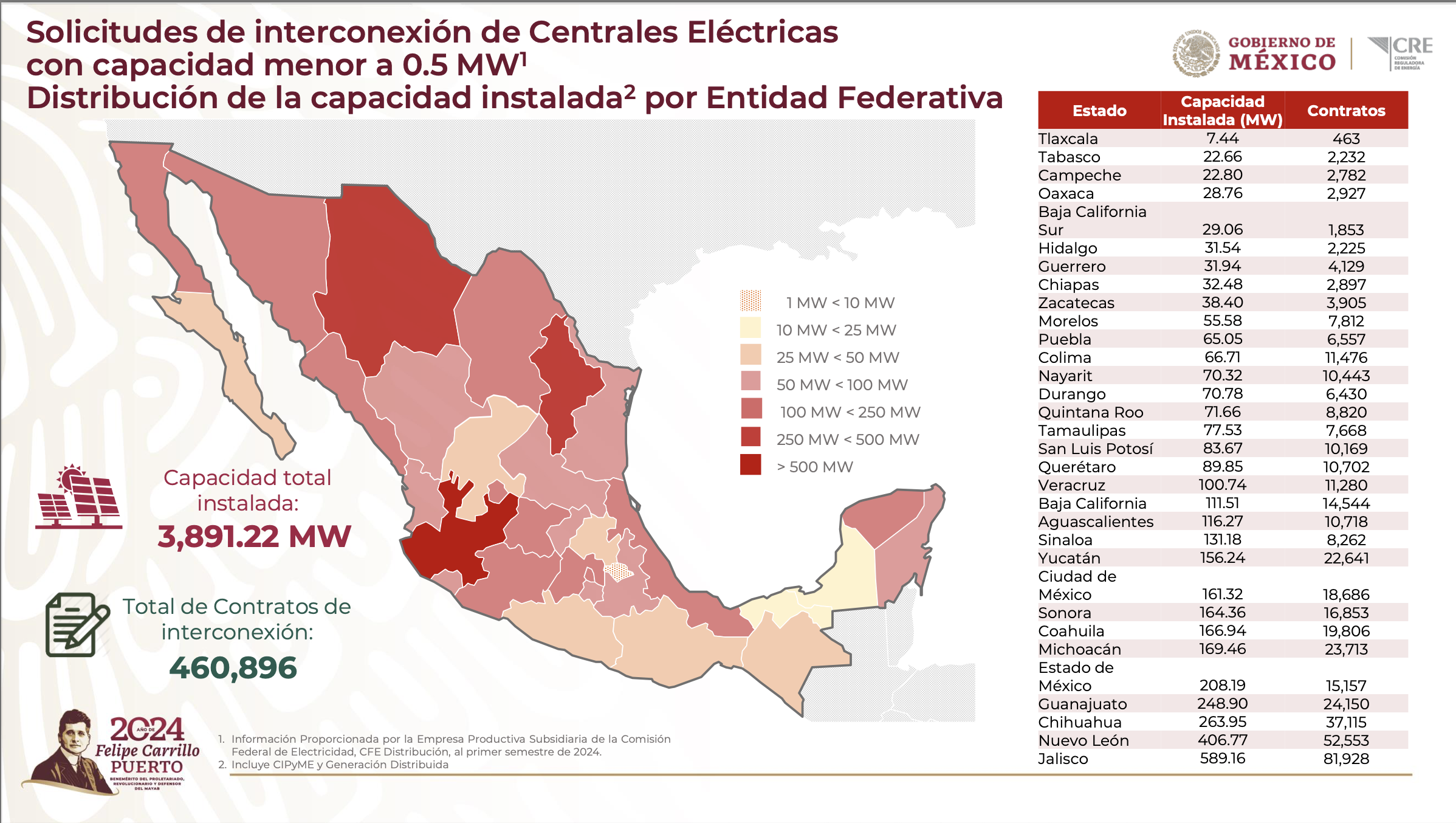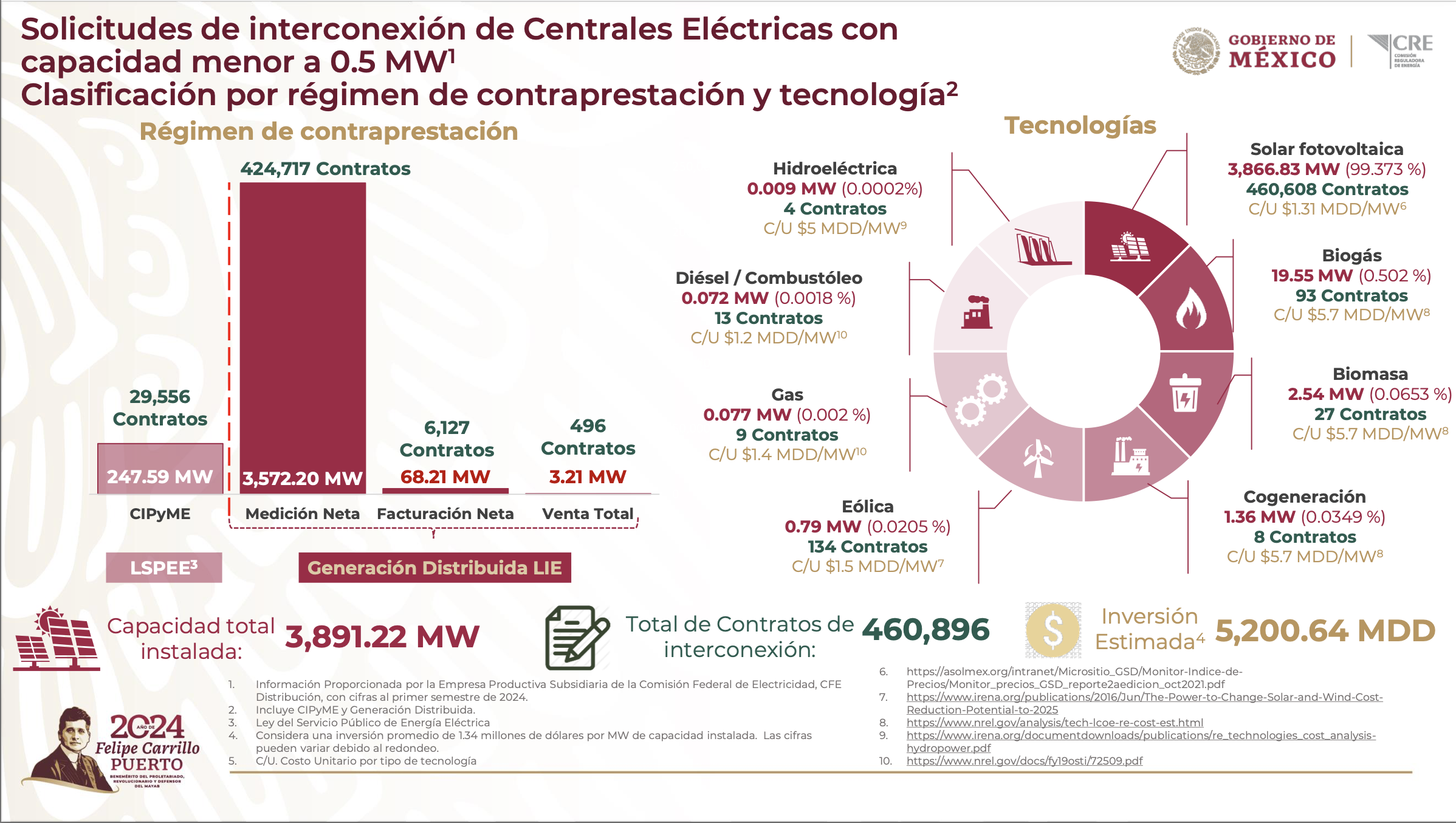Al cierre del primer semestre de 2024, las solicitudes de interconexión de Centrales Eléctricas con capacidad menor a 0.5 MW, alcanzaron 3,891.22 MW de capacidad instalada con 460,896 contratos y una inversión estimada de 5,200.64 millones de dólares, para nuevos máximos históricos acumulados.
