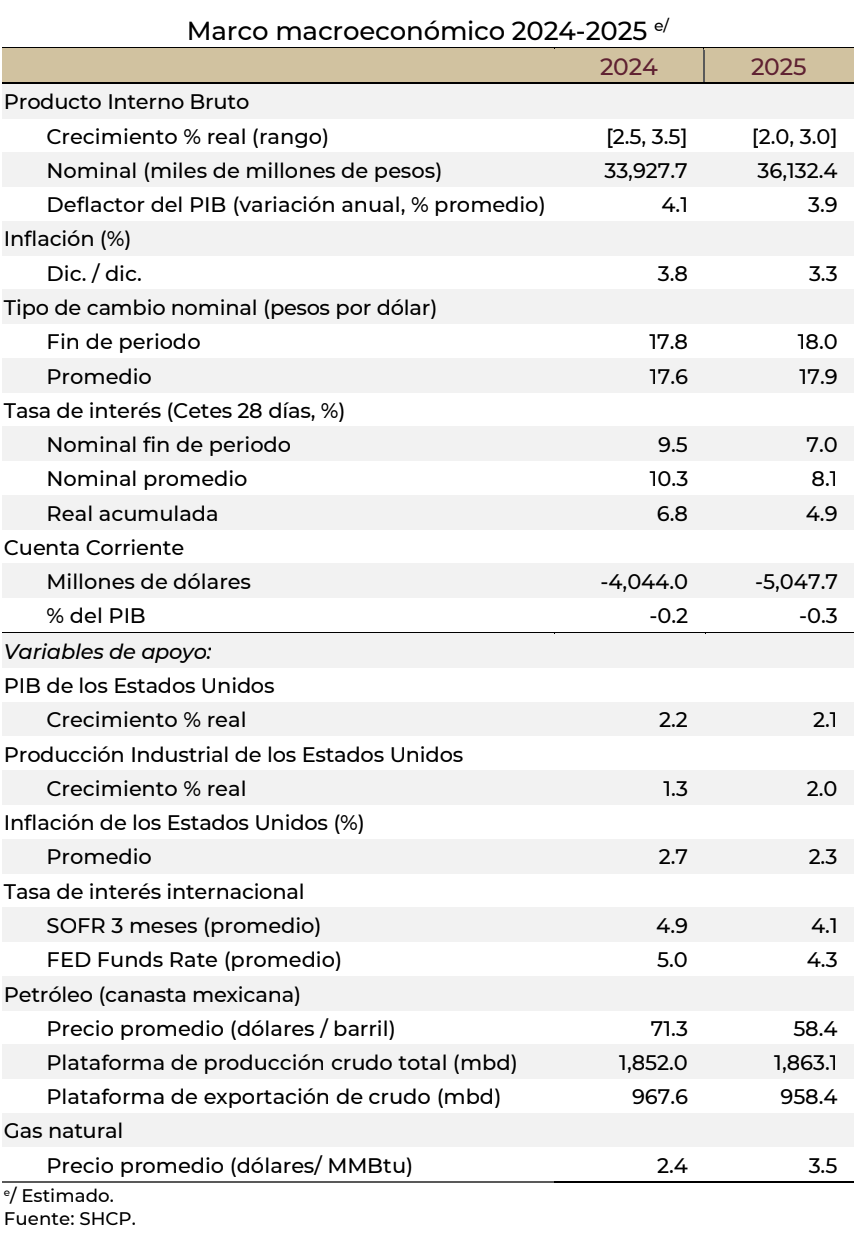 La economía mexicana continuará beneficiándose de una demanda interna vigorosa, altos niveles de inversión estratégica y una mayor integración regional. Este entorno también facilitará la relocalización de empresas y atraerá flujos récord de Inversión Extranjera Directa en sectores clave como tecnología, manufactura y logística. Bajo estas condiciones, se estima que el crecimiento económico de México se sitúe en un rango de 2 a 3% real anual, en línea con las previsiones del Paquete Económico 2024.